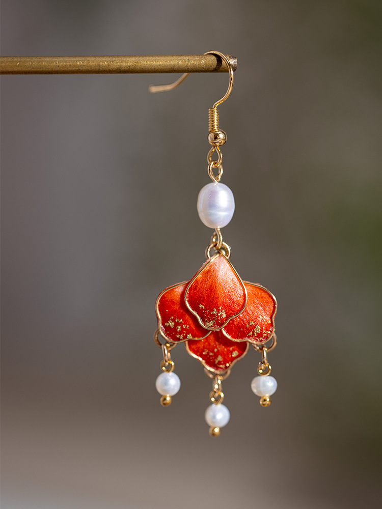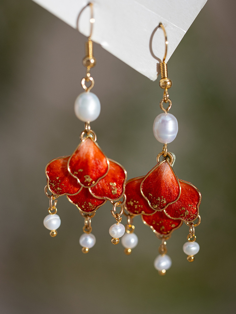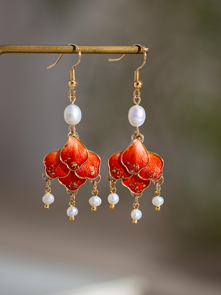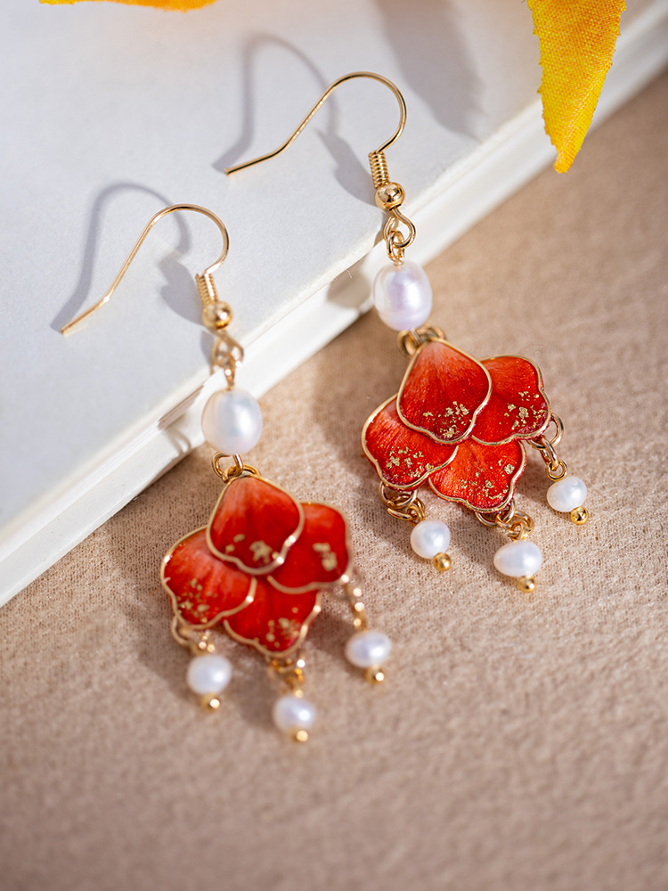 非遺留絨毛花イヤリング赤着痩せ高級感チャイナドレス茶服アクセサリー淡水真珠気質耳飾りクラシック