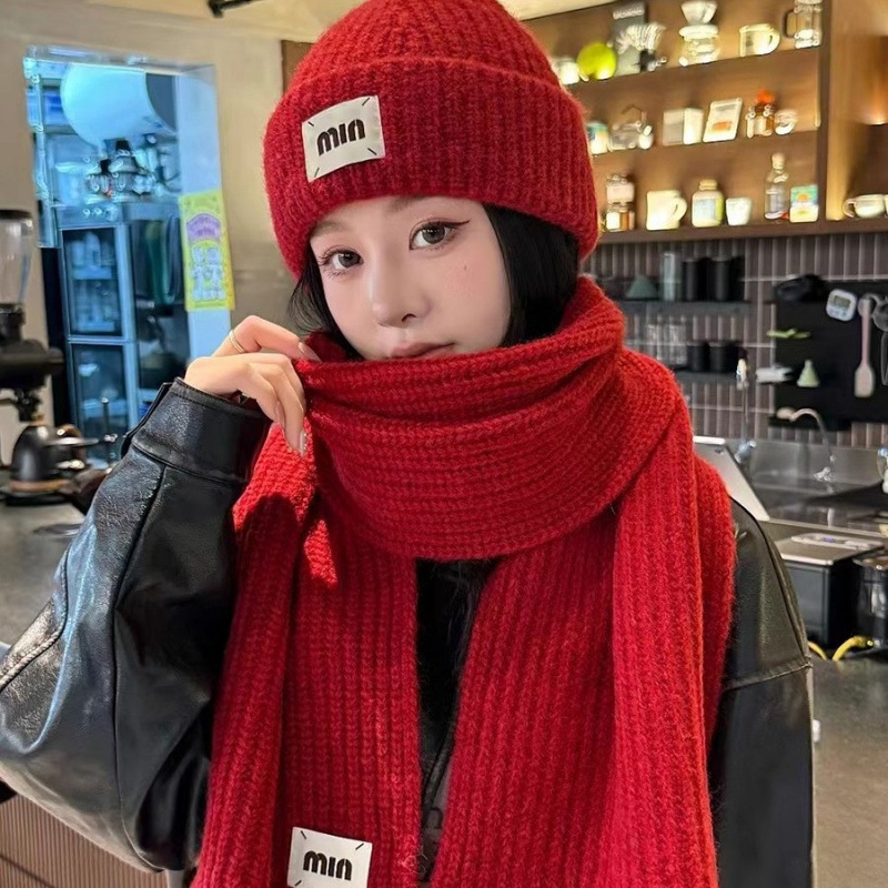 红色大帽檐毛线帽子围巾秋冬季新款本命新年礼物大头针织围脖套装