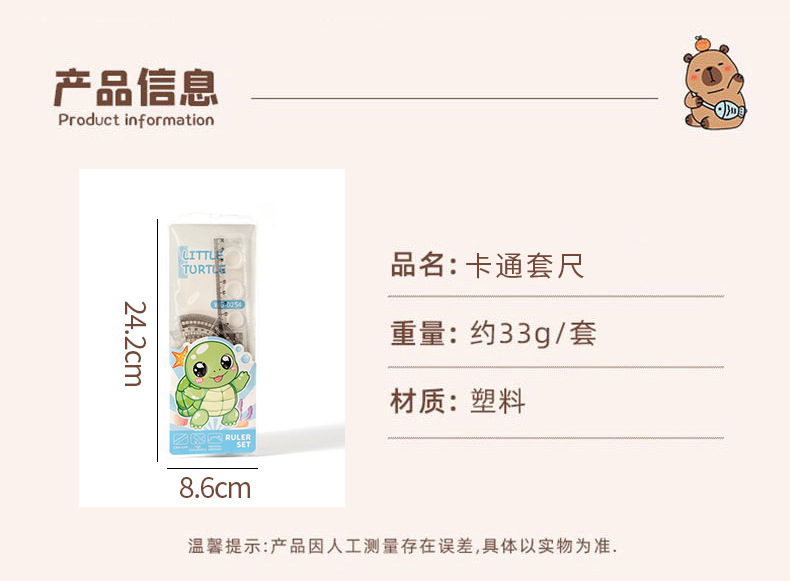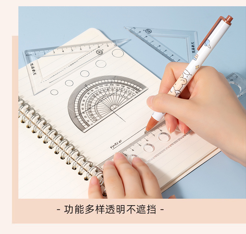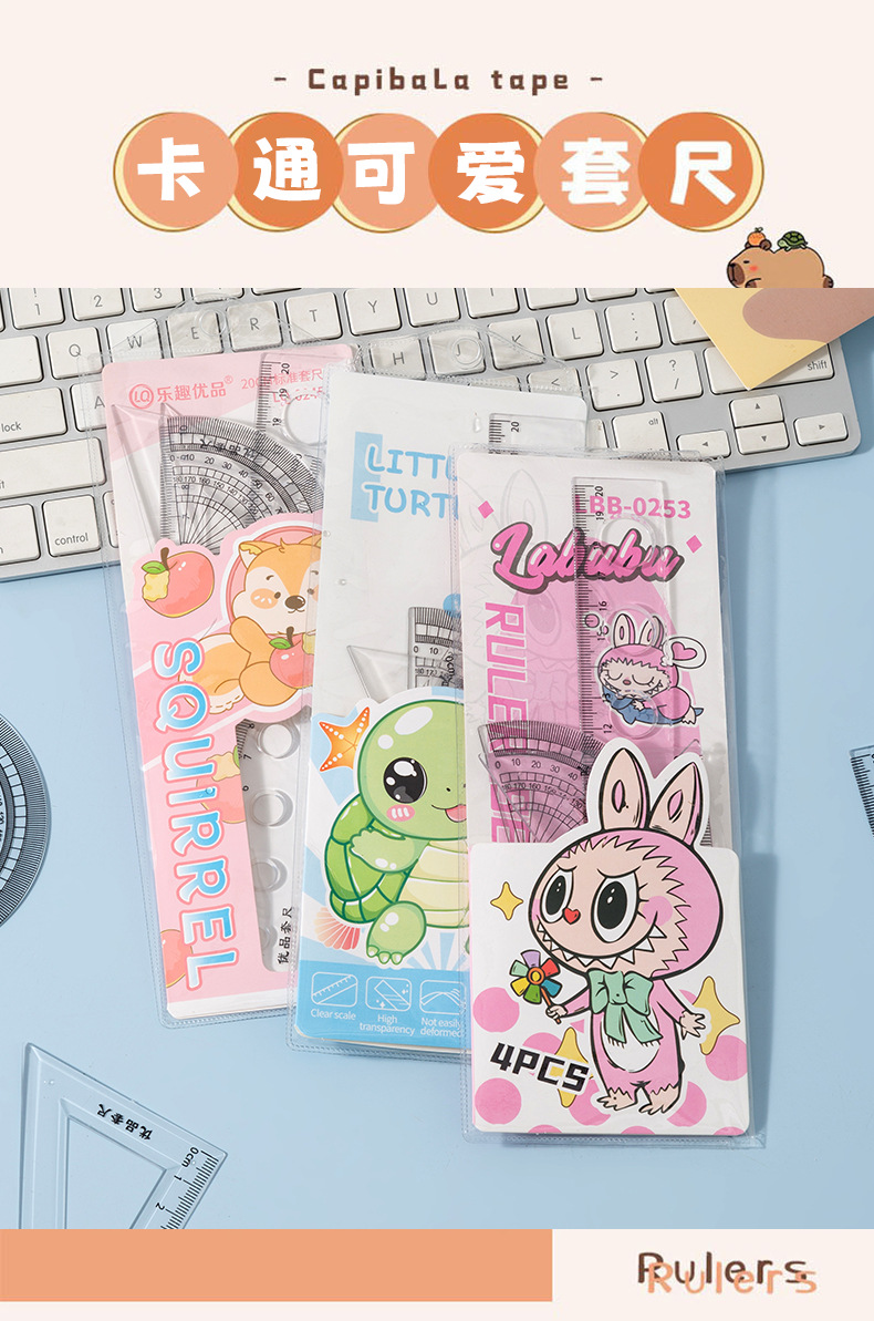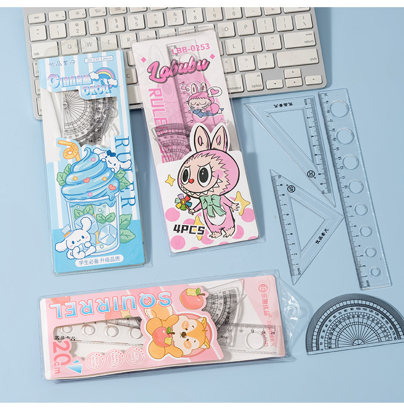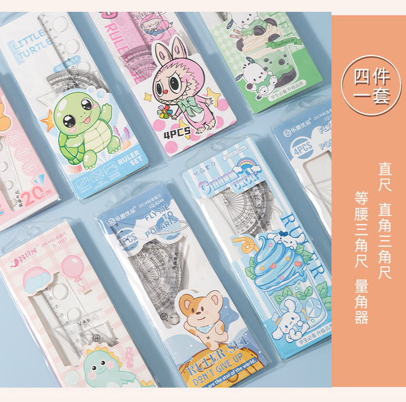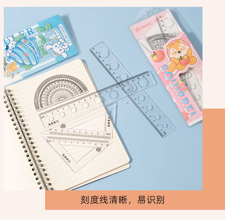 卡通透明尺子套装学生考试四件套直尺三角尺量角器20cm多功能套尺
