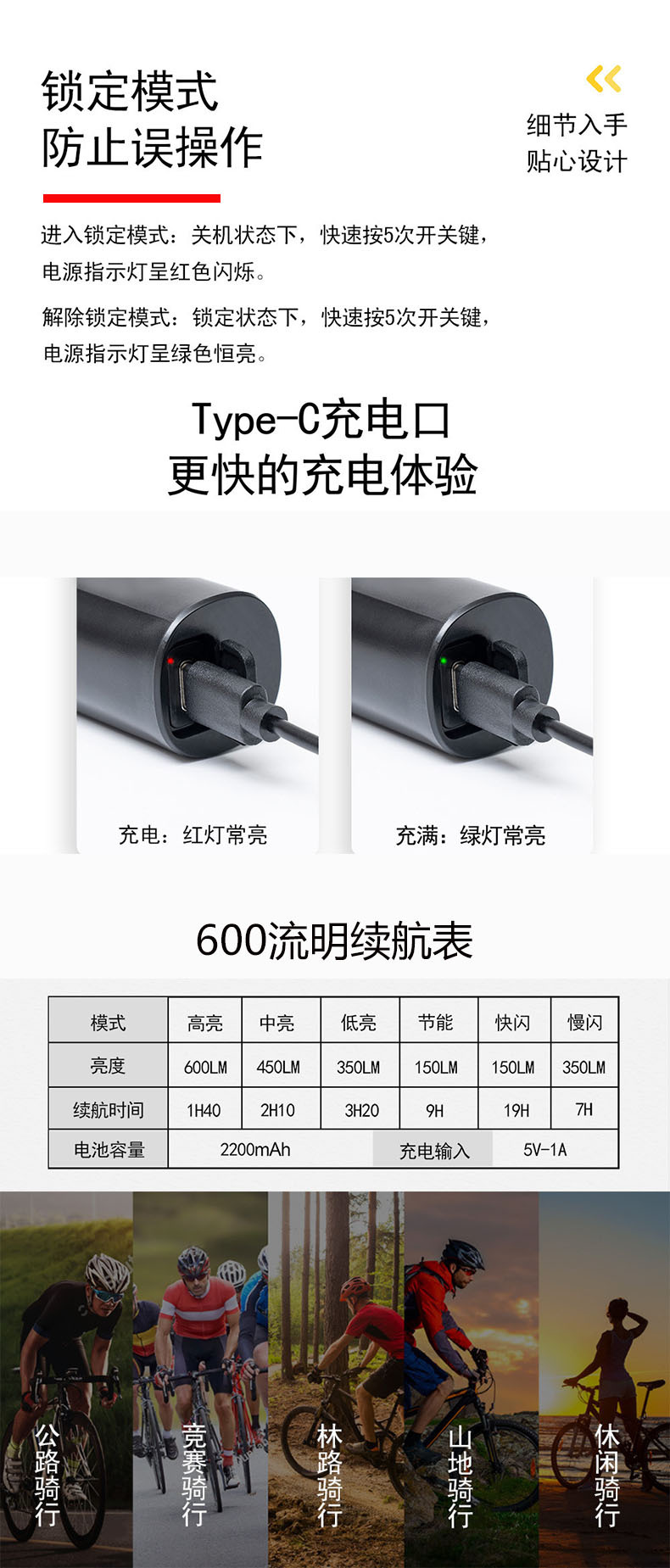 TOUK拓刻道路車ヘッドライト1200ルーメン一体ハンドル吊りUSB充電マウンテンバイク夜騎乗装備