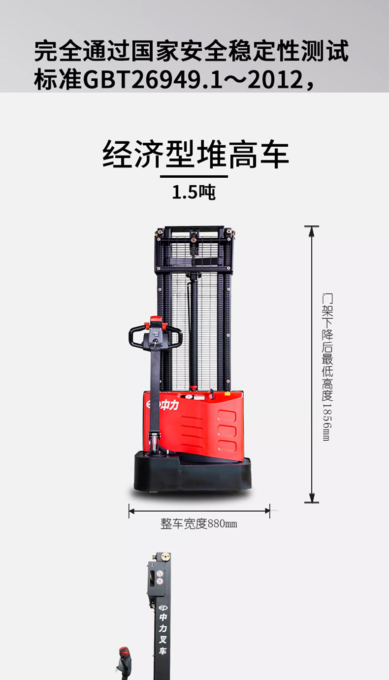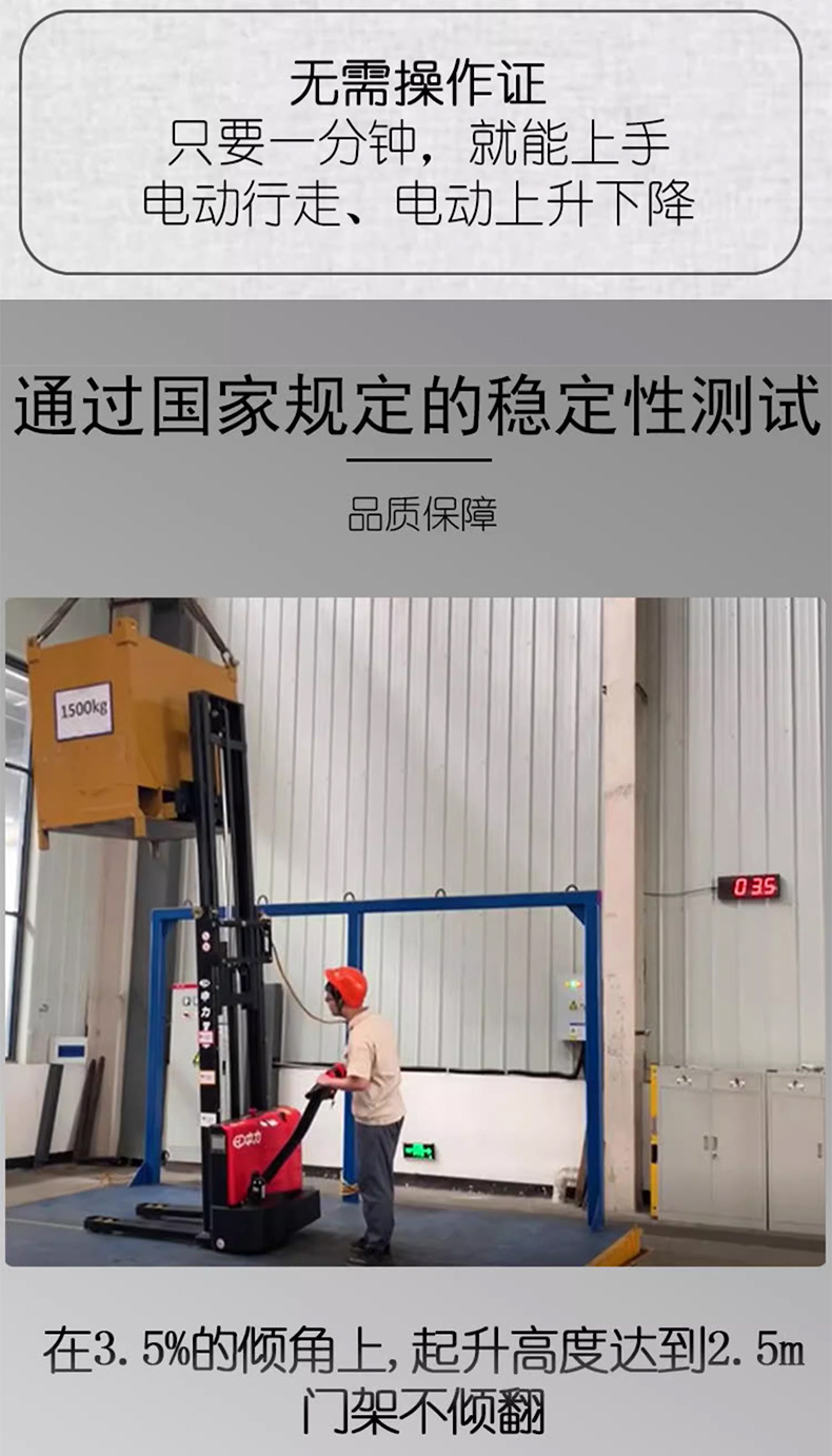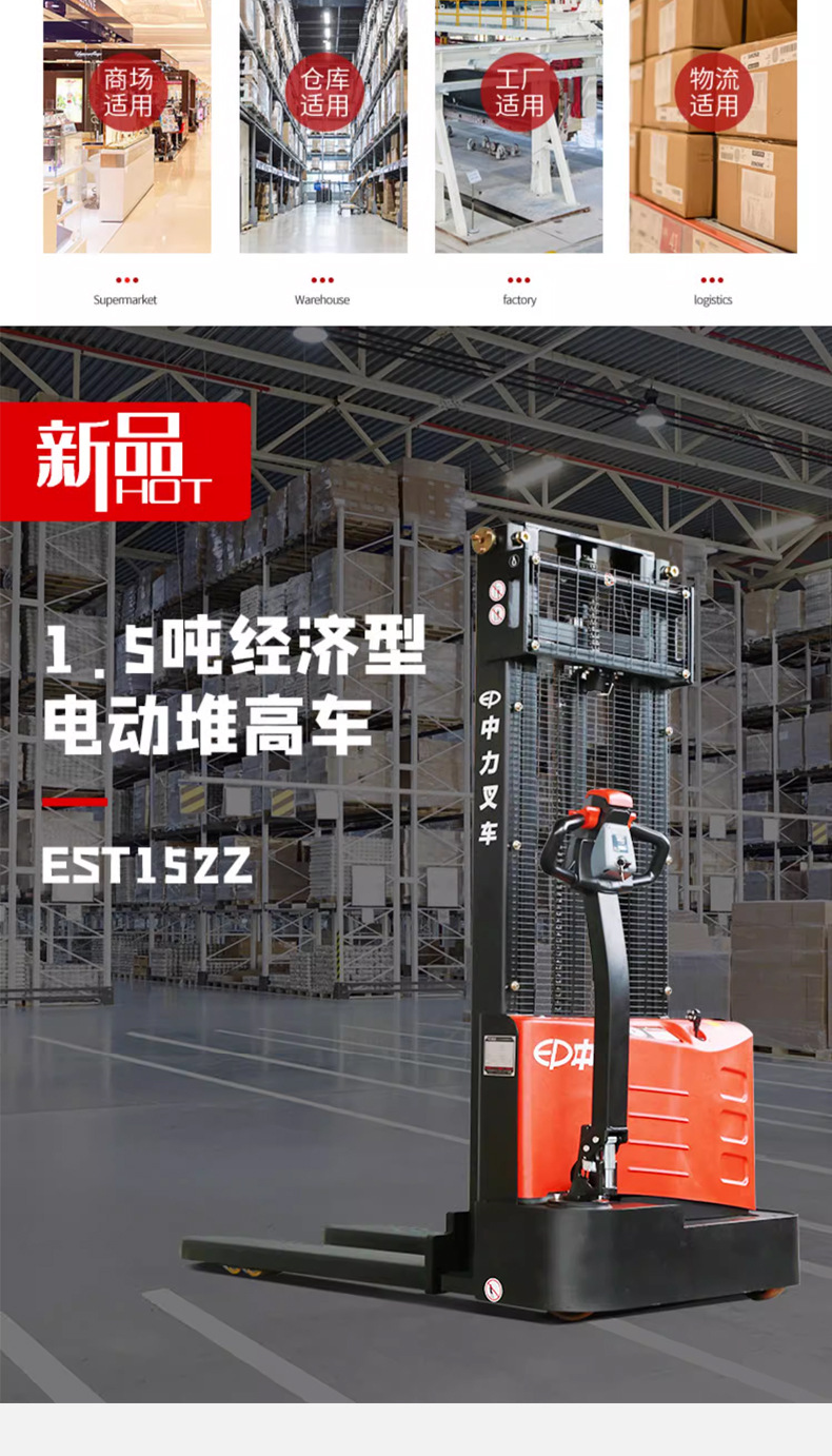 中力1.5トン経済型歩行式全電動スタッカフォークリフト電気ボトル油圧上昇荷車フォークリフト