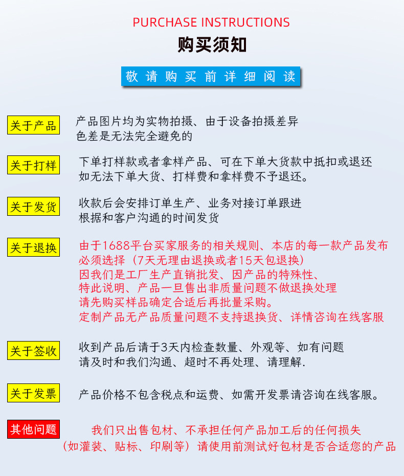 1688.comは中国で生産され、流通している商品を扱うBtoB卸サイトとなります。お客様が弊社サイト内にて仕入処理をされても、日本国内の法律に則り、日本への輸入ができない商材もあり、その場合弊社でも仕入れの手配が出来ません。その際はシステム上で、自動的に注文削除となってしまう事を、恐れ入りますがご了承願います。