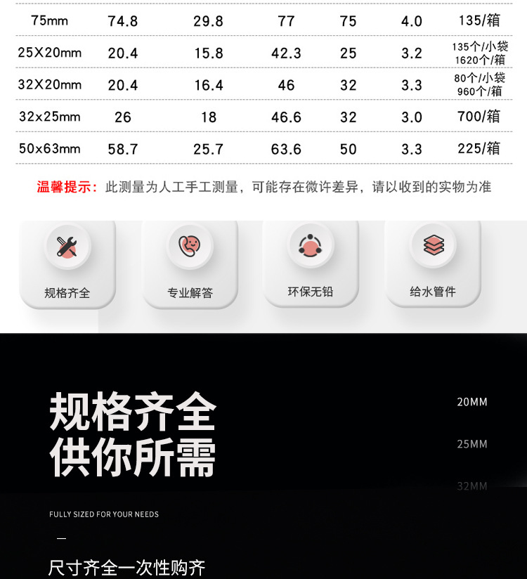 製品仕様 20mm ホワイト [1800本/カートン],25mm ホワイト [1200本/カートン],32mm ホワイト [700本/カートン],40mm ホワイト [480本/カートン],50mm ホワイト [384本/カートン],63mm ホワイト [210本/カートン],75mm ホワイト [138本/カートン],90mm ホワイト [75本/カートン],110mm ホワイト [68本/カートン],20mm グレー [1800本/箱],25mm グレー [1200本/箱],32mm グレー [700本/カートン],40mm グレー [480本/カートン],50mm グレー [384本/カートン],63mm グレー [210本/カートン],75mm グレー [138本/カートン],90mm グレー [75本/カートン],110mm グレー [68本/箱],20mm ブルー [1800本/カートン],25mm ブルー [1200本/カートン],32mm ブルー [700本/カートン],40mm ブルー [480本/カートン],50mm ブルー [384本/カートン],63mm ブルー [210本/カートン],75mm ブルー [138本/カートン],90mm ブルー [75本/カートン],110mm ブルー [68本/カートン]