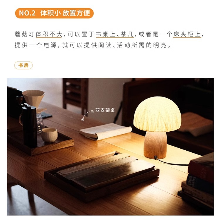 手作りの日本式リビングルームの書斎のベッドの上の机のお茶のいくつかの装飾の小さい木目の暖かいキノコの装飾の電気スタンド