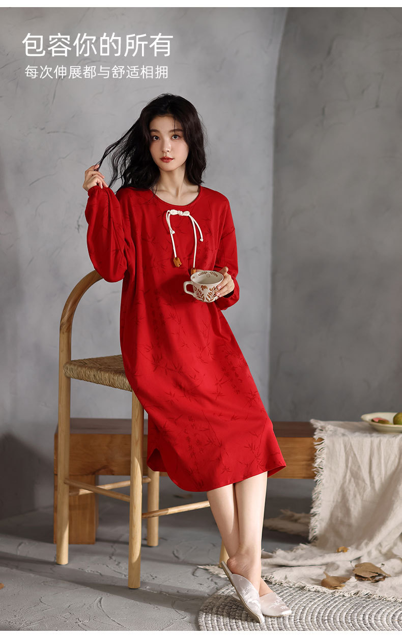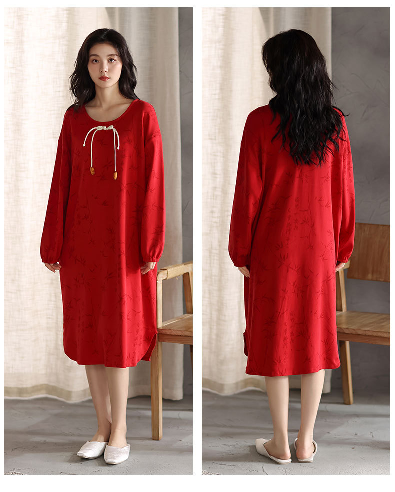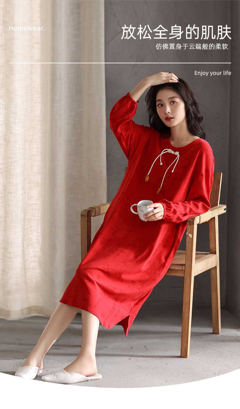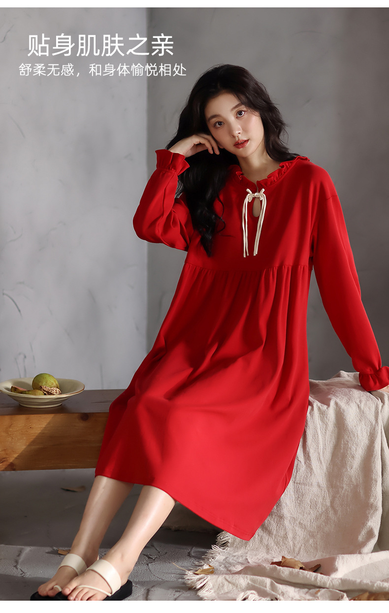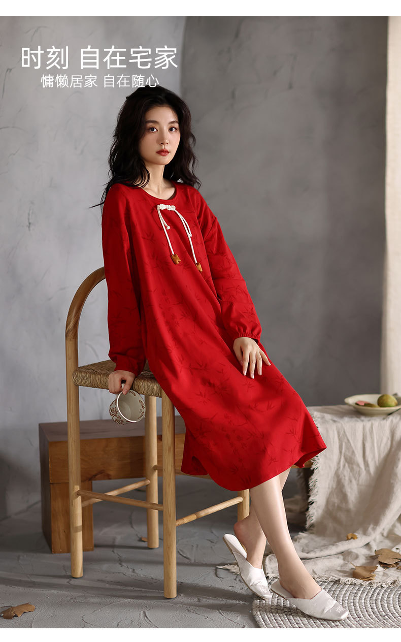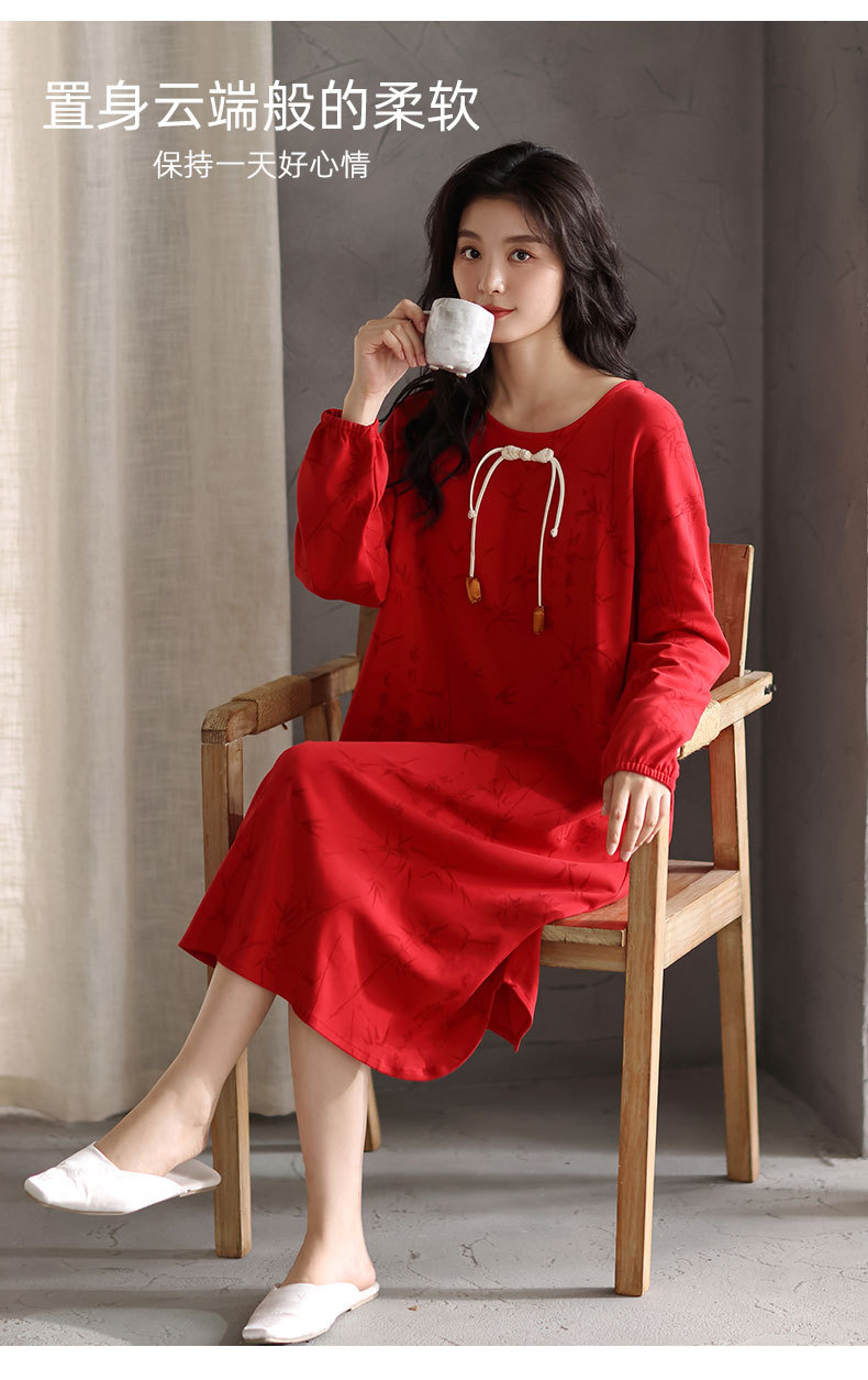 新商品のワンピースのパジャマの女性春秋の純綿の長袖の大きい赤色の本命の年の中国風の綿のパジャマの家の服