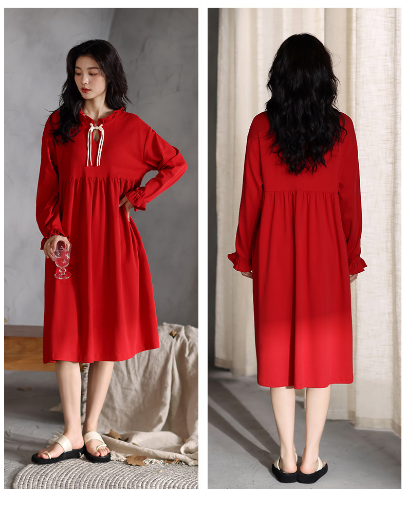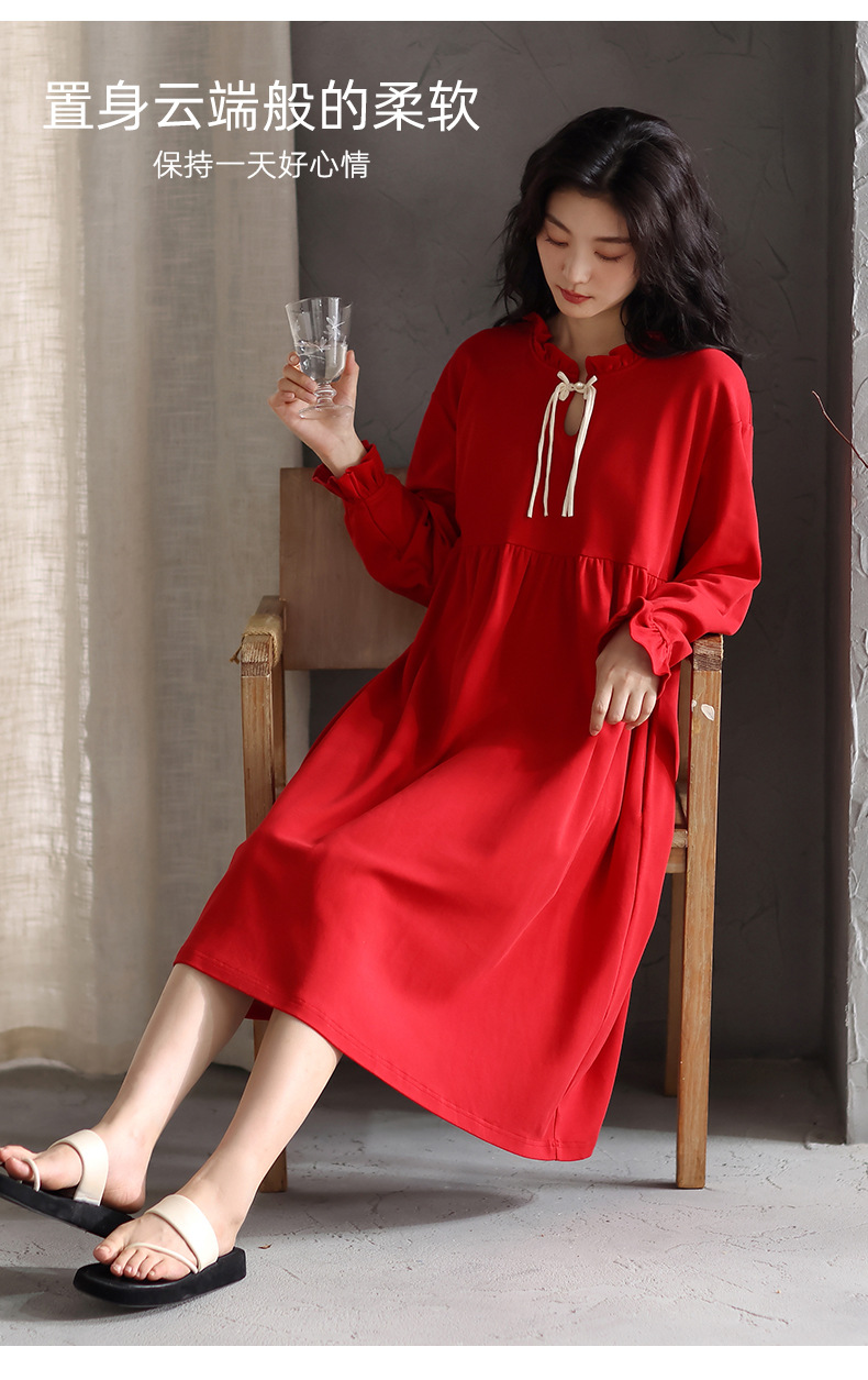 拉架棉女士睡裙春秋季长袖中长裙圆领套头宽松大码孕妇纯棉连体裙