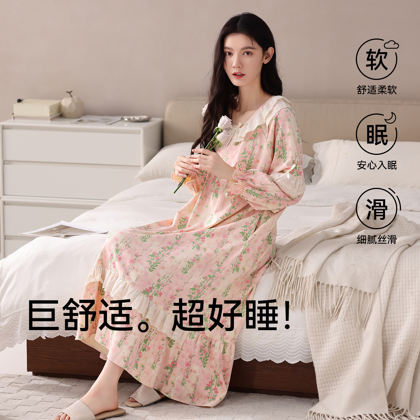 寝ているスカートの長袖の女性のパジャマの純綿の春と秋の新型は家庭服のワンピースの長袖の妊婦のワンピースを着ることができます。