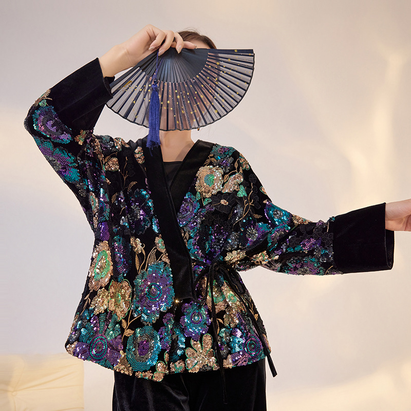 新中国式刺繍花亮片重工コート国風気質色とりどり花紫上着m3041