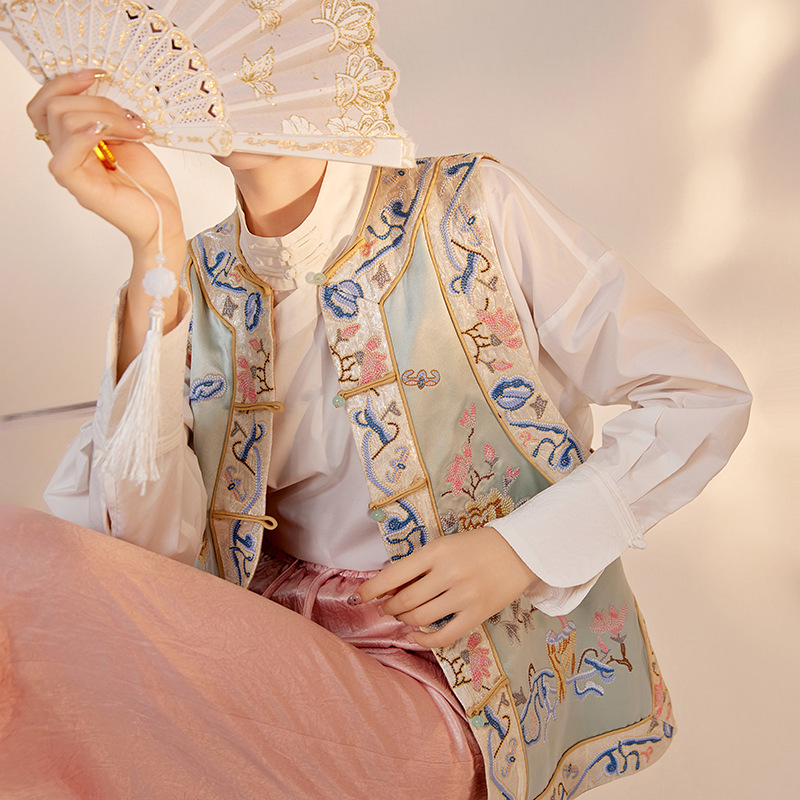 新型レトロ立襟単列ボタン国風ベスト2025夏刺繍デザイン绢糸馬甲N4045