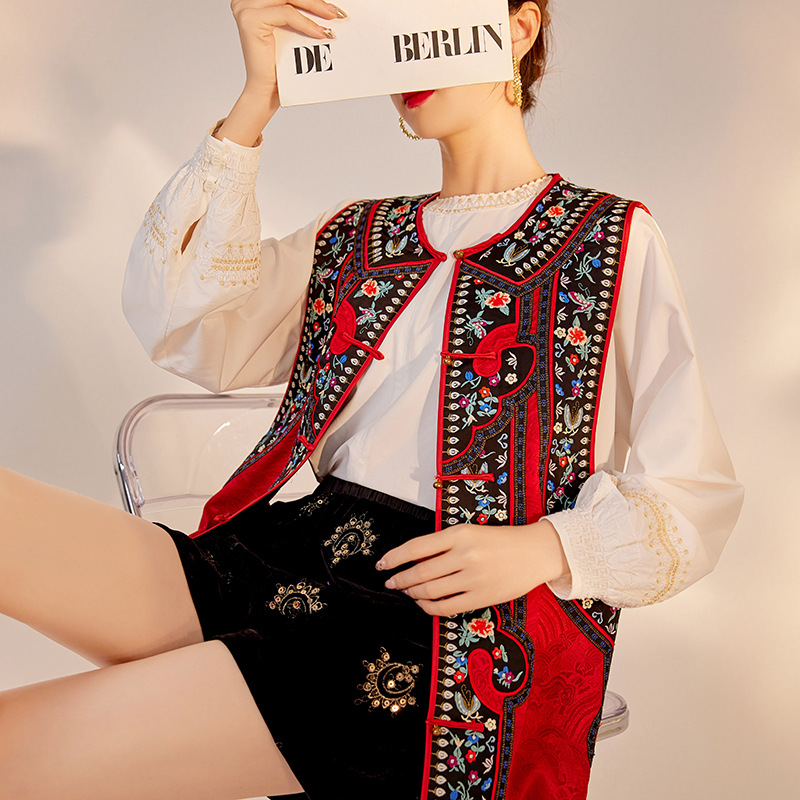 高級中国風ベスト 秋用 丸襟 重刺繍 酢酸繊維 新中式 留め具付きジャケット 女性用 ZXモデル M7089