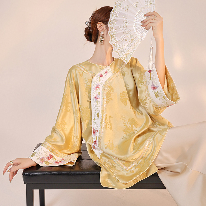 2025年秋新作 中華風 花柄刺繍 スパンコールシャツ オールドマネースタイル エレガント サテンブラウス M3003