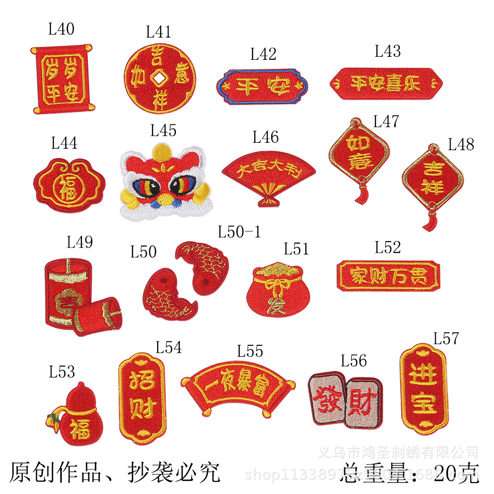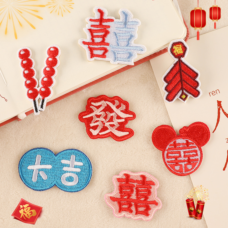 新年の祝福刺繍布ステッカー自己粘着衣類アクセサリー富を手に入れるコンピュータ刺繍ステッカー在庫卸売