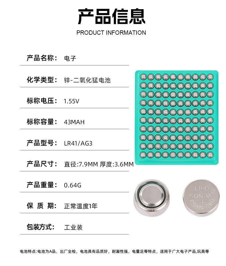 工業用包装AG3ボタン電池LR41発光玩具アルカリ電子1.55V亜鉛マンガン時計電子電池