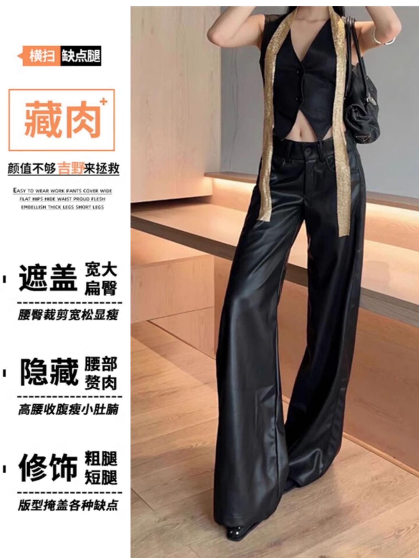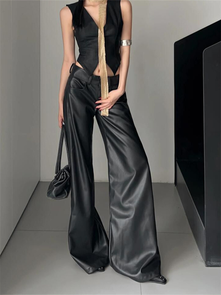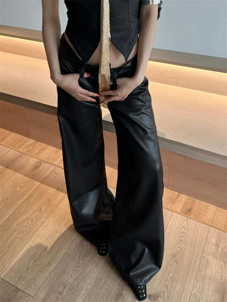 アメリカの茶色の皮のズボンの女性の大きいサイズの秋冬の高腰のゆったりしている広腿のズボンの小さい人のカジュアルなストレートなズボンのpu皮のズボン