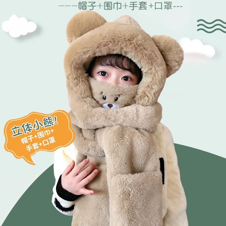 小熊帽子围巾一体女新秋冬季加绒围脖防寒保暖毛茸茸护耳帽二合一