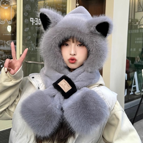 韩版毛绒可爱狐狸耳帽子围巾一体女秋冬季脖骑车保暖两件套连帽围