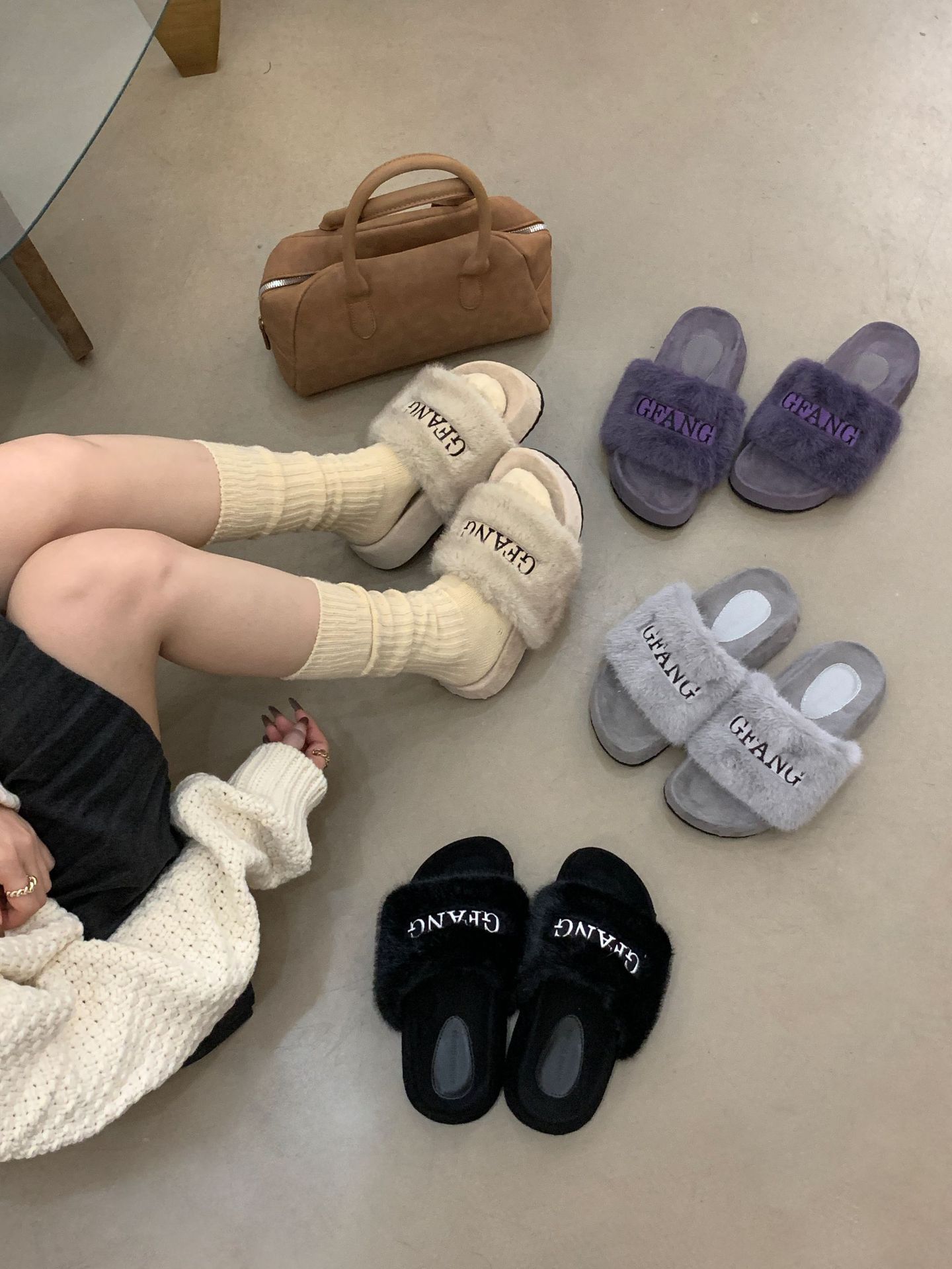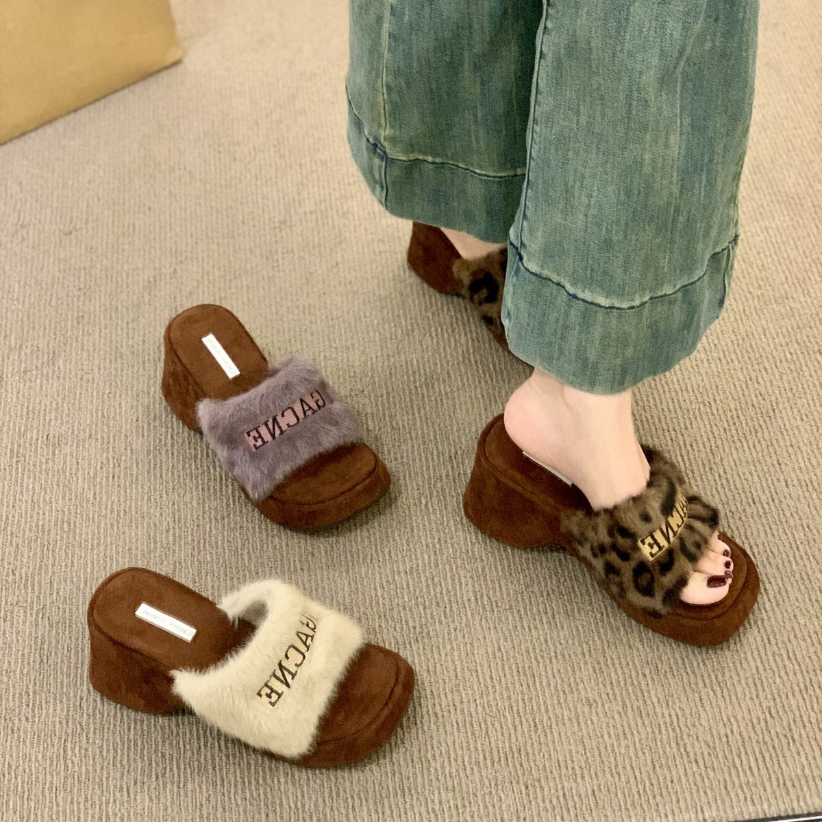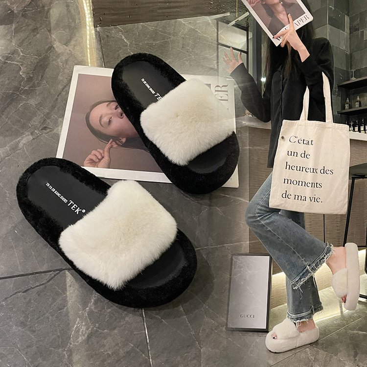厚い底のファッションは色の毛のスリッパを合わせます。