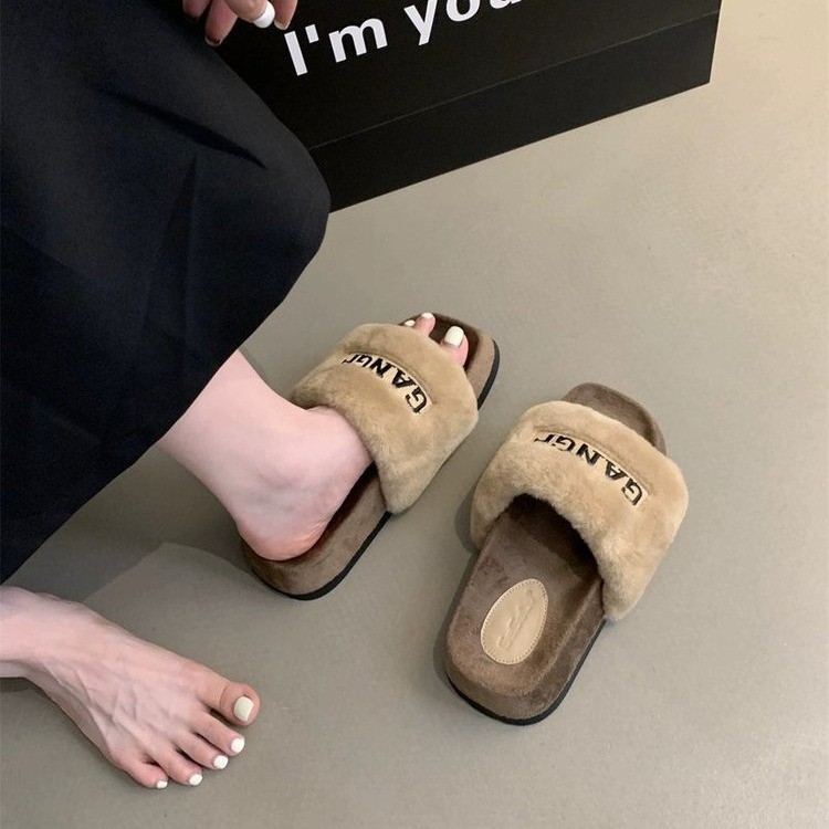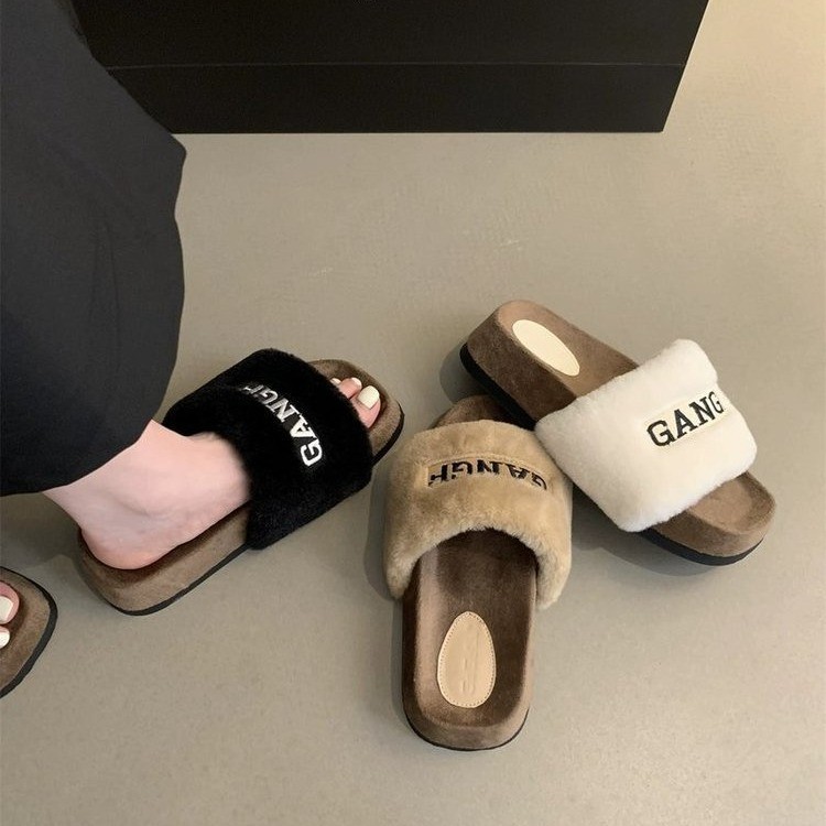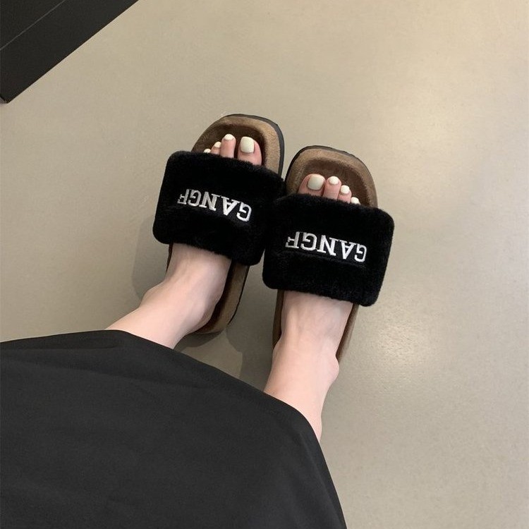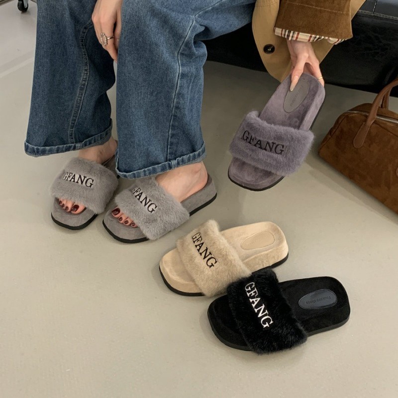 2025秋冬季新款外穿毛毛拖鞋女网红字母刺绣厚底棉拖鞋露趾一字拖