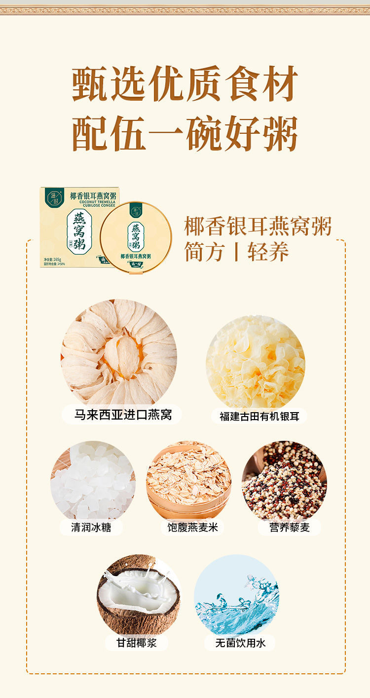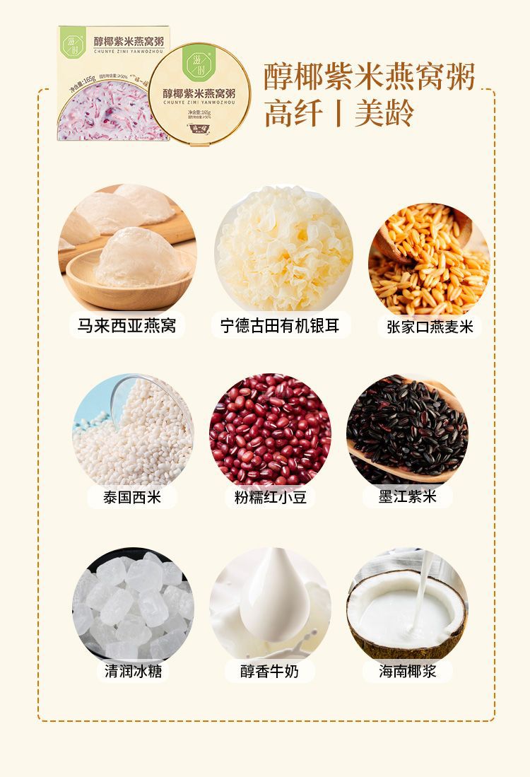 梱包仕様 ココナッツトレメラツバメの巣粥 6 杯 + ココナッツ紫米とツバメの巣粥 6 杯,生ココナッツオートミール魚浮き粥 6 杯 + 活力四鎮魚浮き粥 6 杯,生ココナッツ*2ボウル+バイタリティ*2ボウル+ポプラナッツ*2ボウル