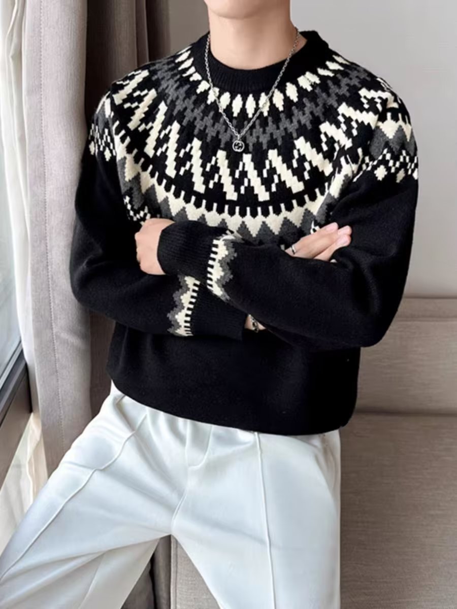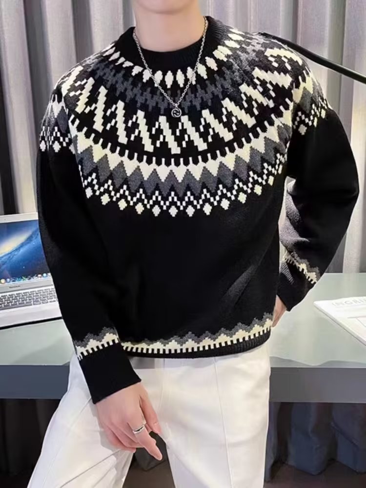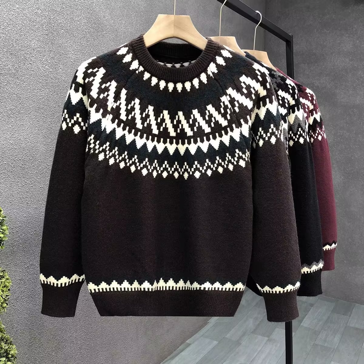 セーター男2024秋冬新作ファッションブランド上着ファッション丸首プルオーバー日本系レトロジャカードコート