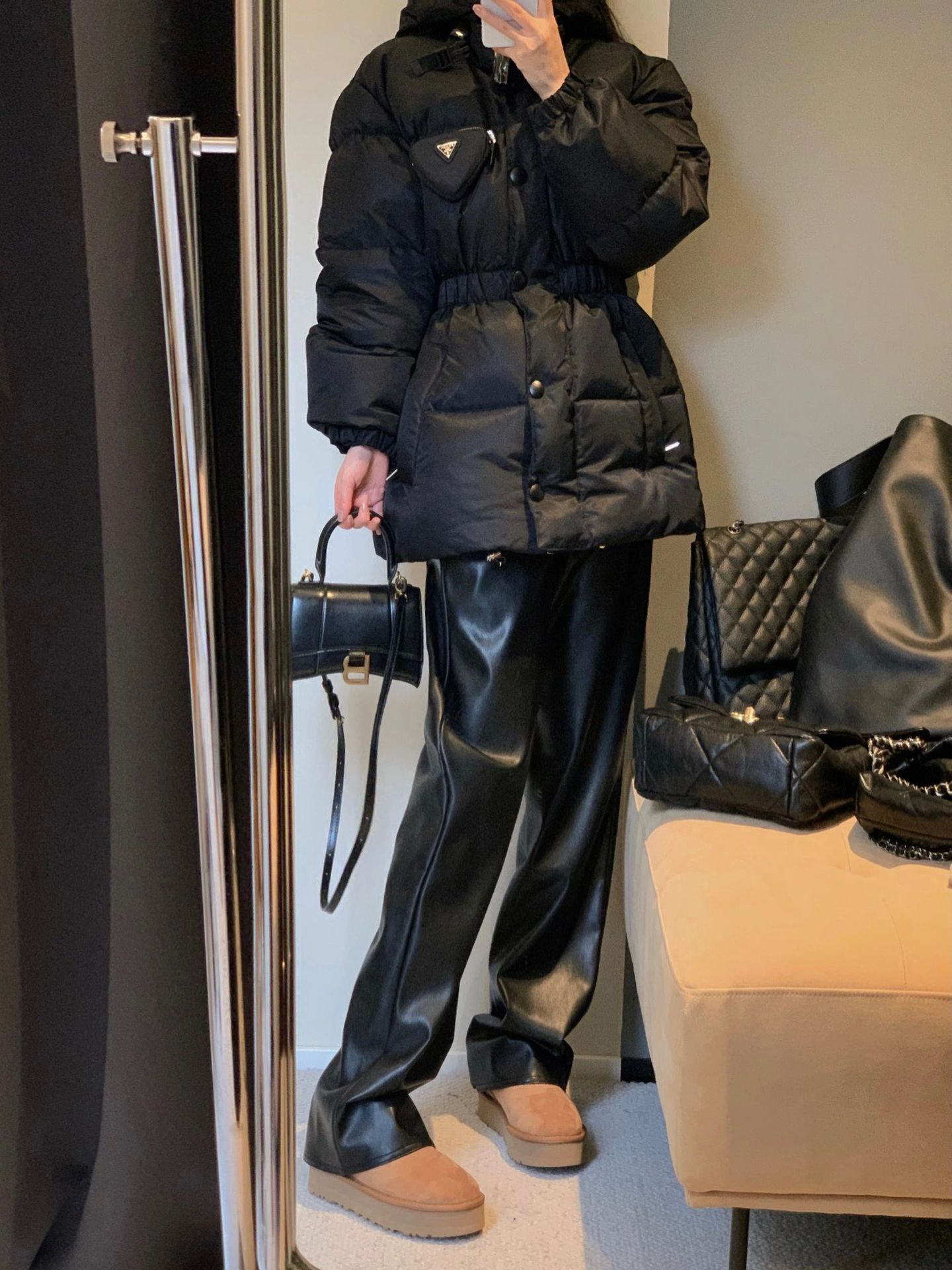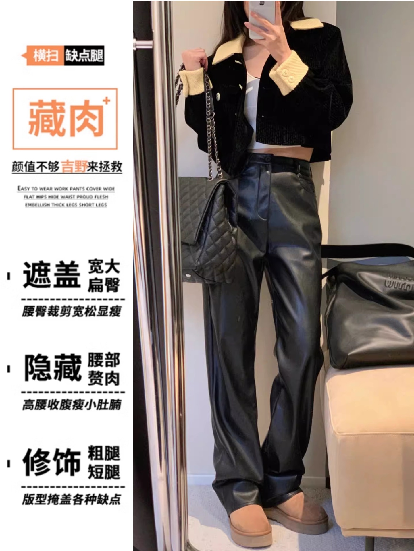 黒のストレートPUの皮のズボンの女性の秋冬の大きいサイズの太っているmmのギャルの高い腰の秋の百合の狭い版の広い足のモップのズボン