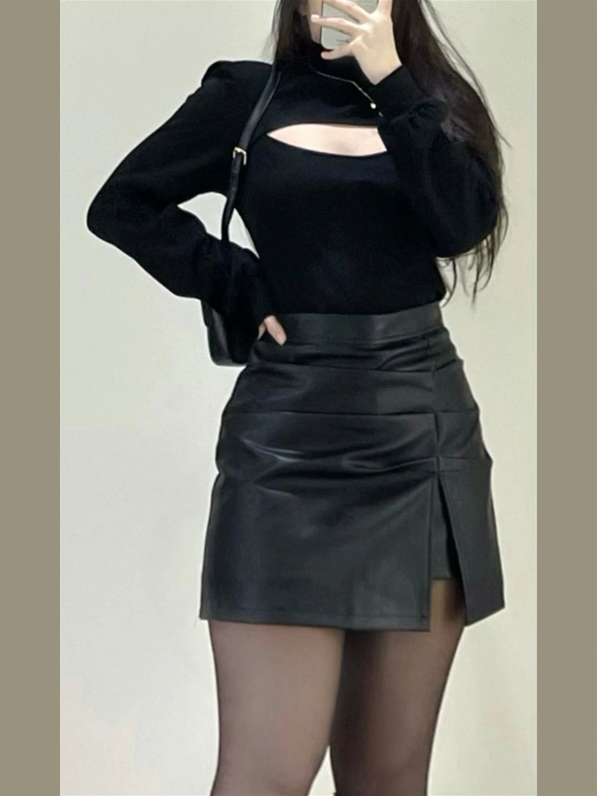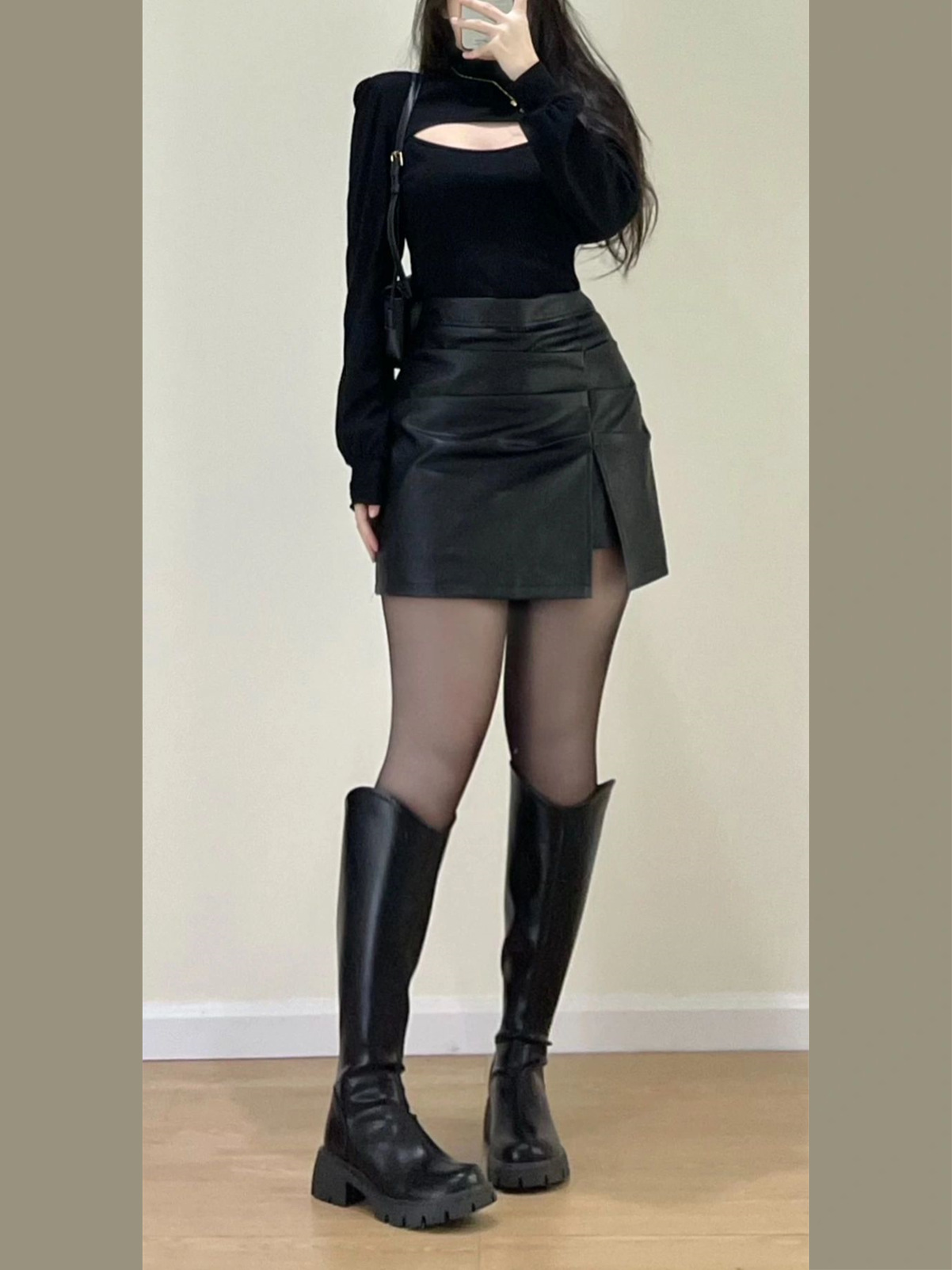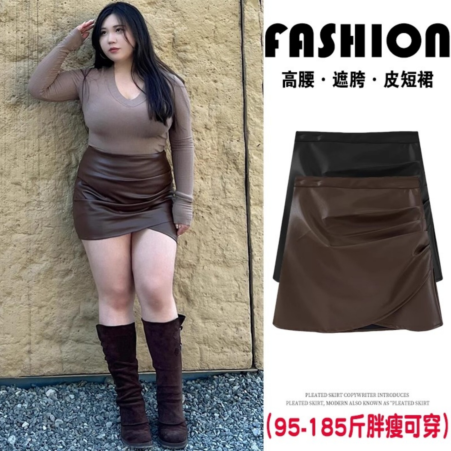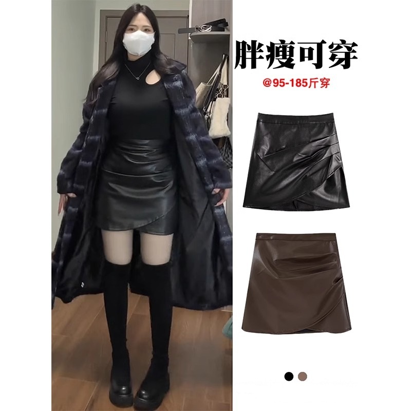咖色不规则pu皮半身裙女秋冬款配靴子里大码胖miu气包臀a字短裤裙
