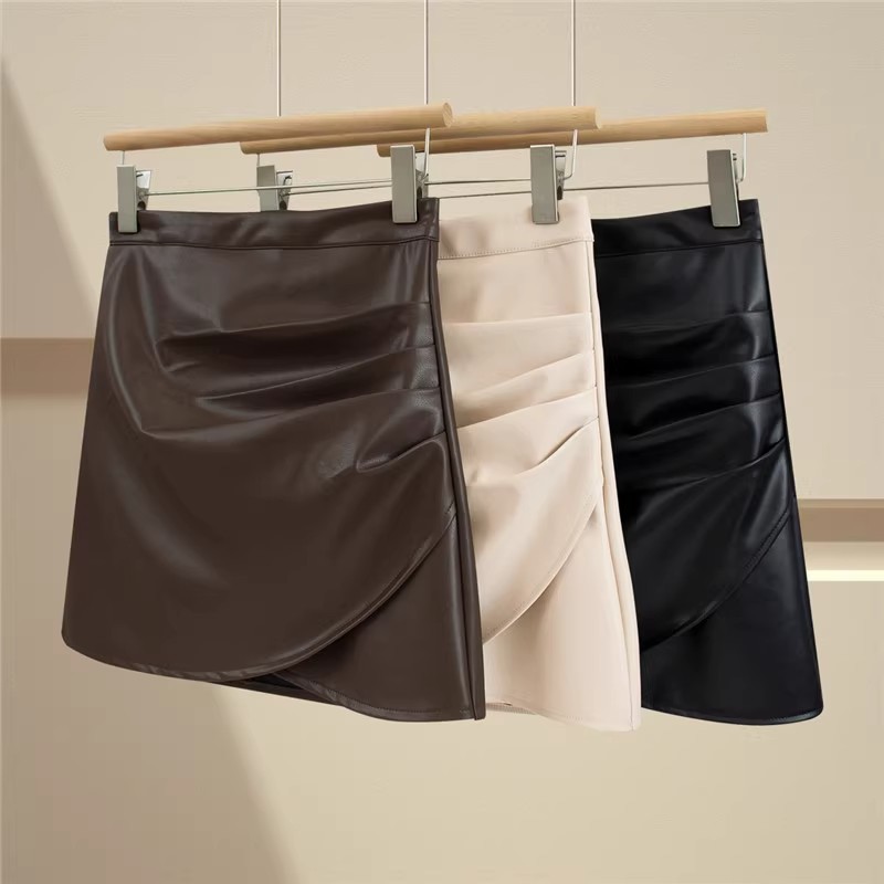新款咖色PU皮裙半身裙女秋冬大码不规则褶皱高腰显瘦包臀皮短裙