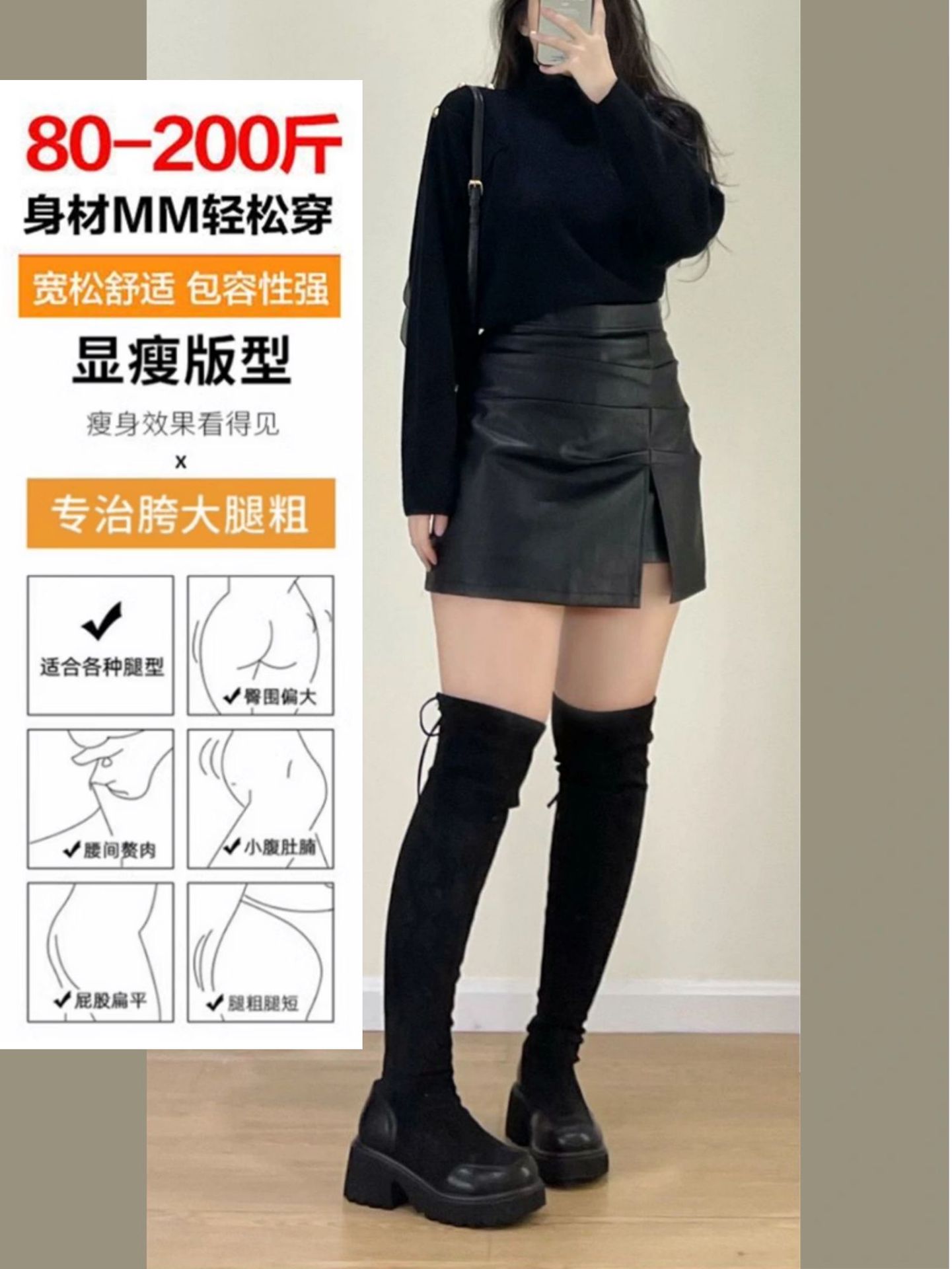 ギャルの黒い皮のスカートのしわの半身のスカートの女性の早秋の大きいサイズの太っているmmの高腰のa字のデザイン感のpu皮のa字のショートスカート