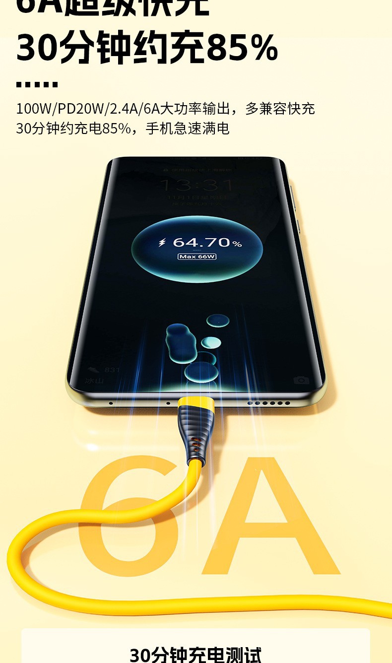 Type-cシングルヘッドデータ線6aフラッシュ充電適用アンドロイド華為栄光米車載携帯電話充電線プレゼント