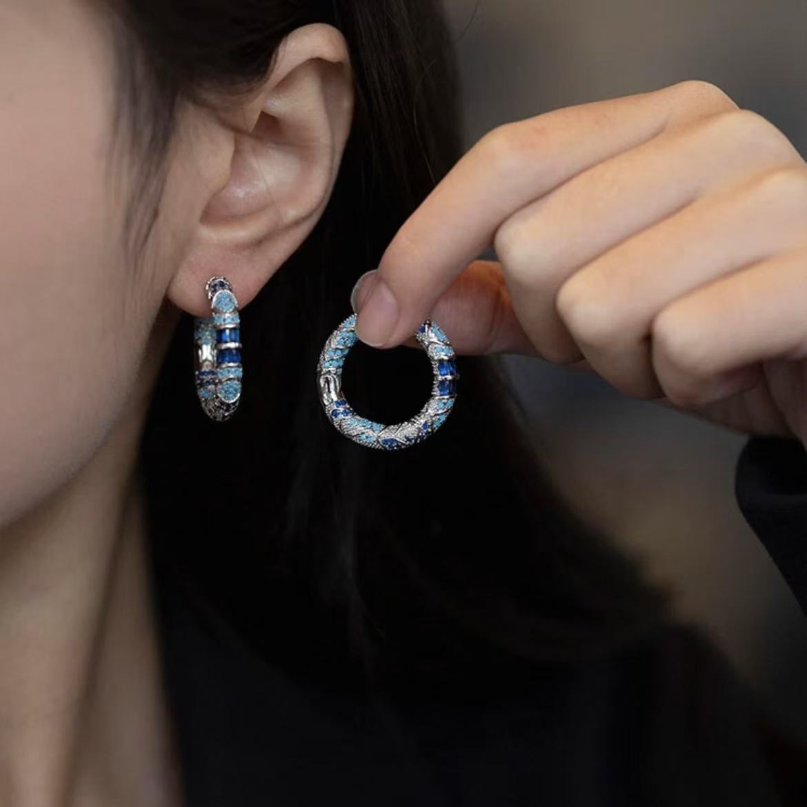 新民族風ブルーエナメル耳輪ファッション高級感気質イヤリングレトロ軽贅沢ファッション大気耳飾り
