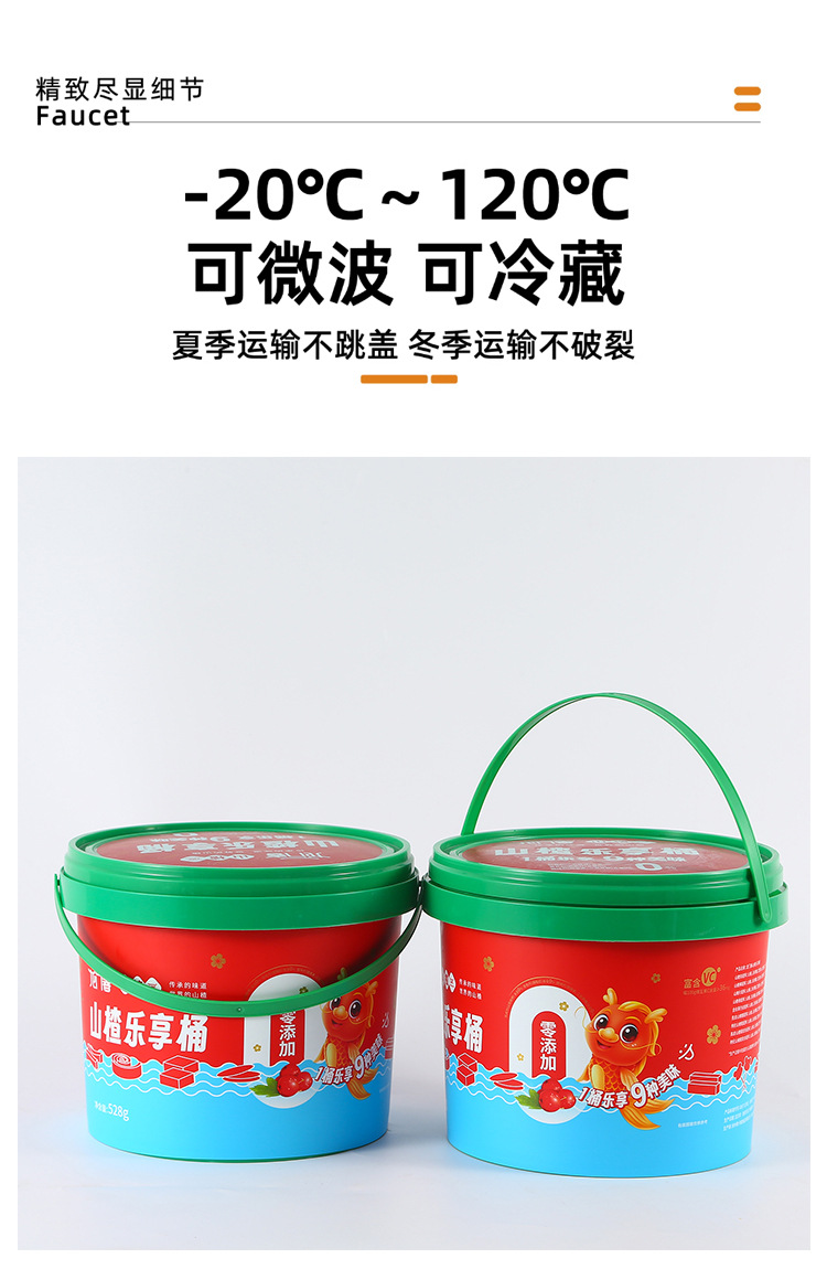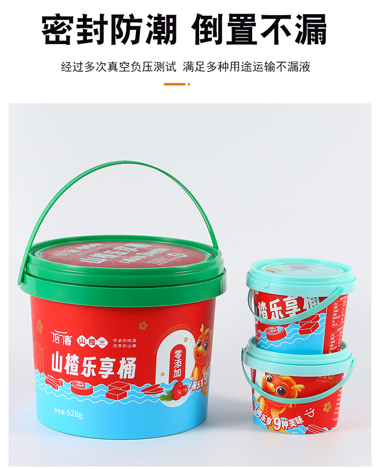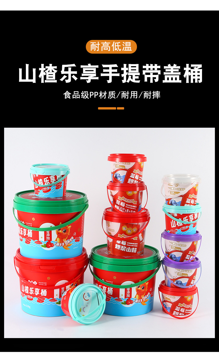 蓋付き食品グレードの携帯用バケツ、カラープリントのサンザシエンジョイバケツ、複数仕様の密封プラスチック丸型バケツ、小樽