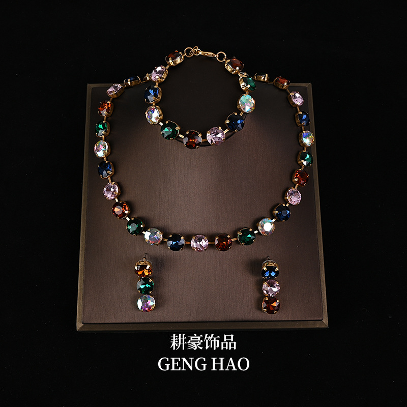 ジェムストーンチェーンレトロ宮殿スタイルカラーガラスドーパミンスタイルレインボービーズイヤリングブレスレットネックレスセット