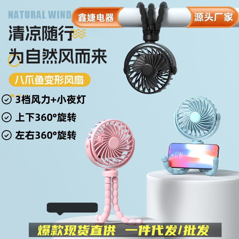 国境を越えた小さなファン低騒音ベビーカーファン多機能デスクトップ夜灯八爪魚付き携帯電話スタンド