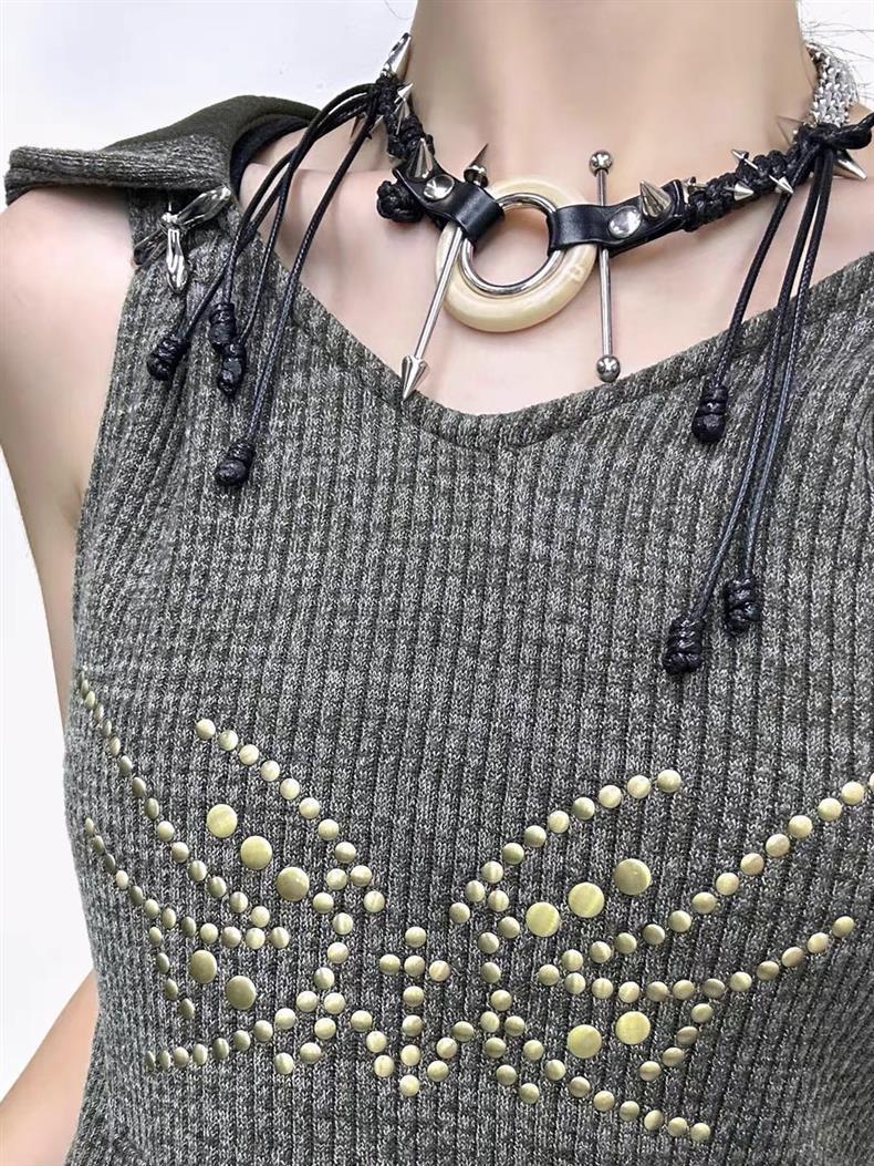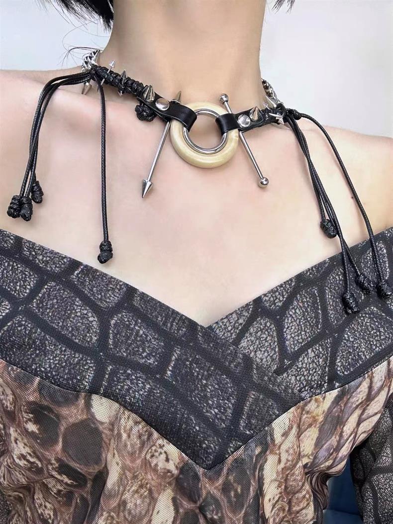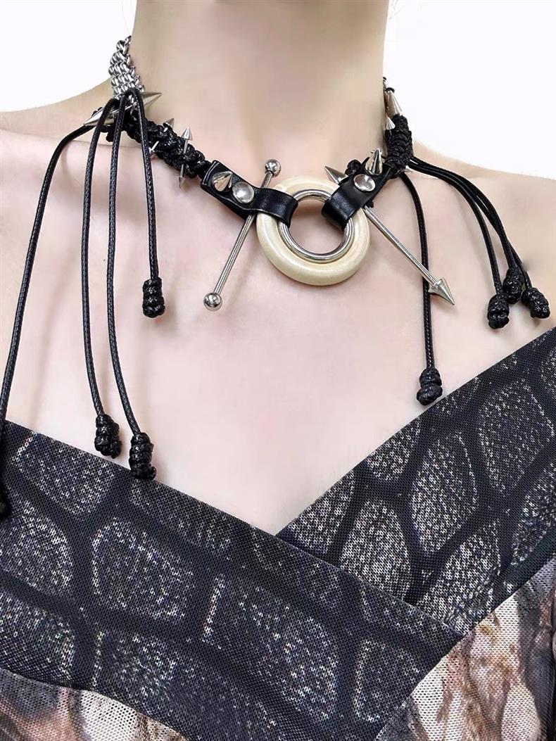 RORYオリジナル廃土パンクシリーズ革紐フリンジネックレス高級リベットリング鎖
