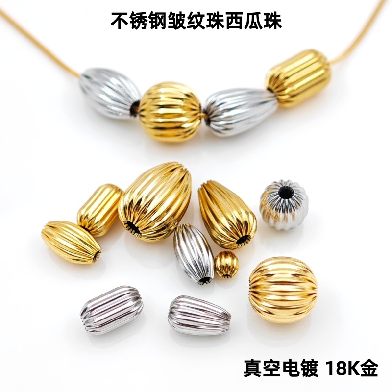 18K包金皱纹西瓜珠镀真金不锈钢串珠diy饰品配件条纹橄榄冬瓜珠
