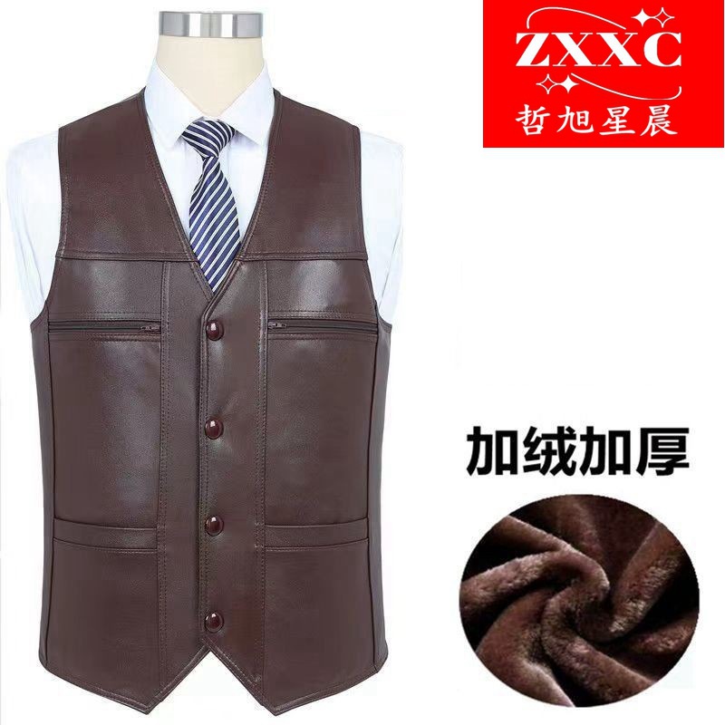 在庫処分 高品質良質レザーベスト レザー一体型ベスト メンズ 中高年 秋冬 裏起毛 厚手 父親用ベスト
