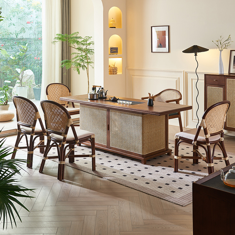 北欧実木茶テーブルと椅子の組み合わせ新中国式藤編茶台オフィス家庭用セット一体禅意泡茶台