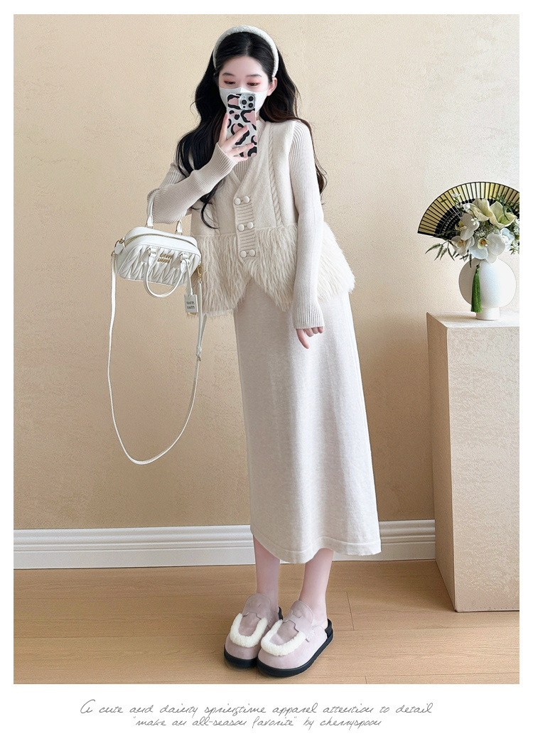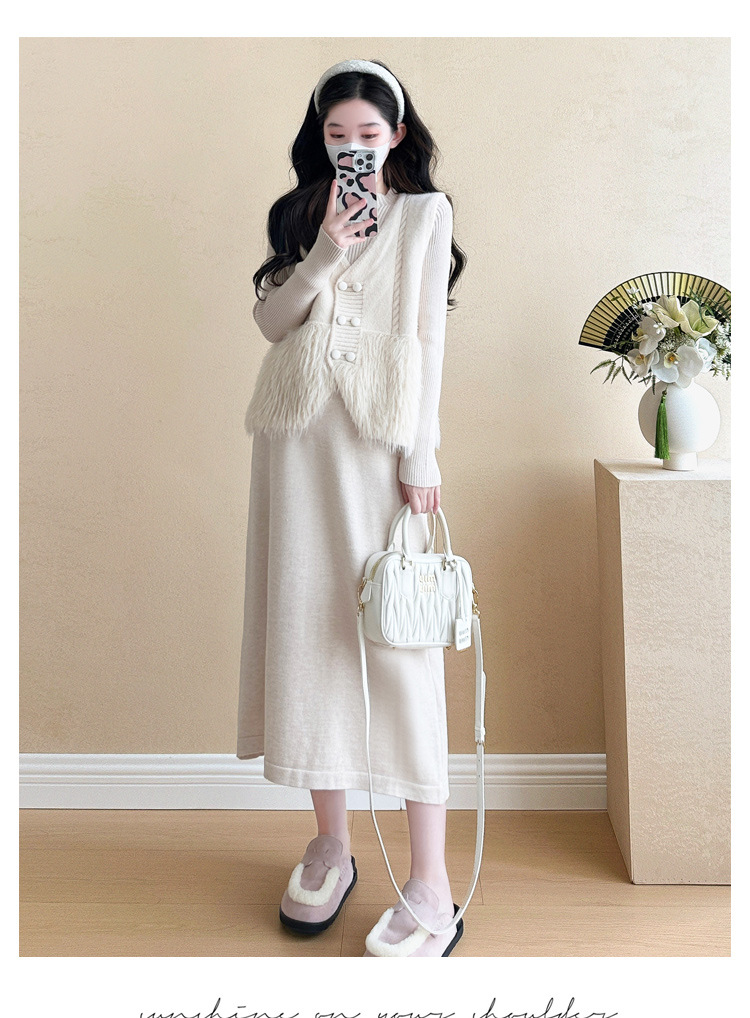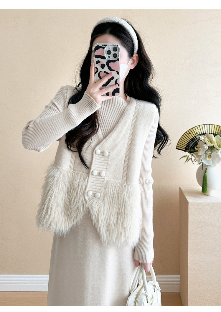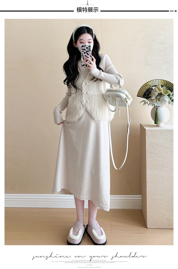 妊婦の小さい香風のスーツの女性の春秋のフランスの気質の高い襟の毛のワンピースのニットのワンピースの外でベストを掛けます。