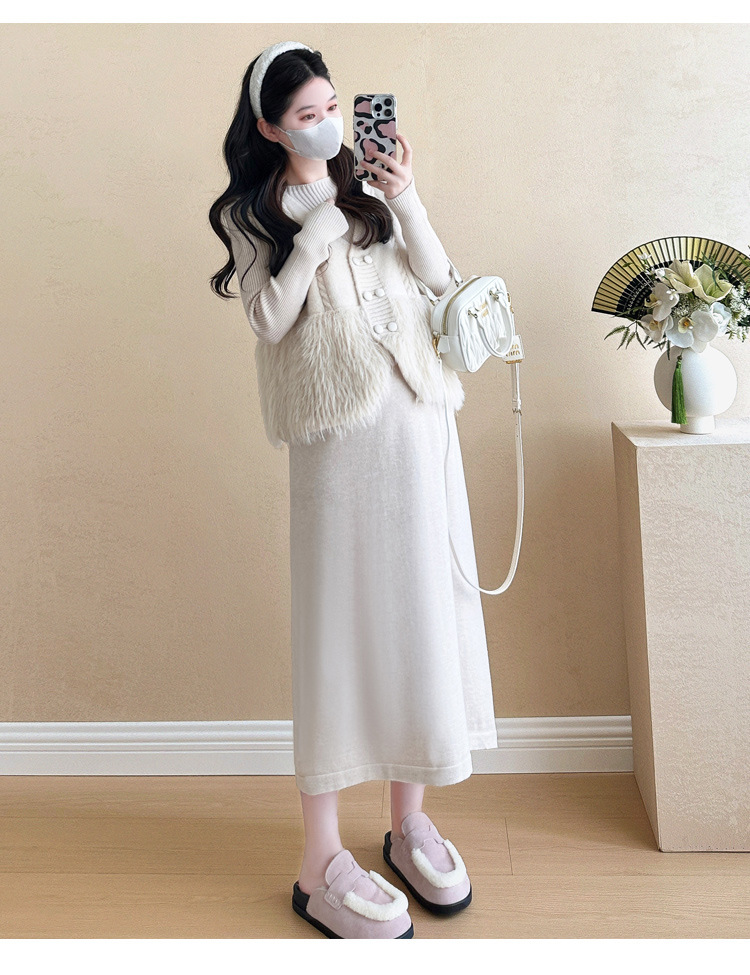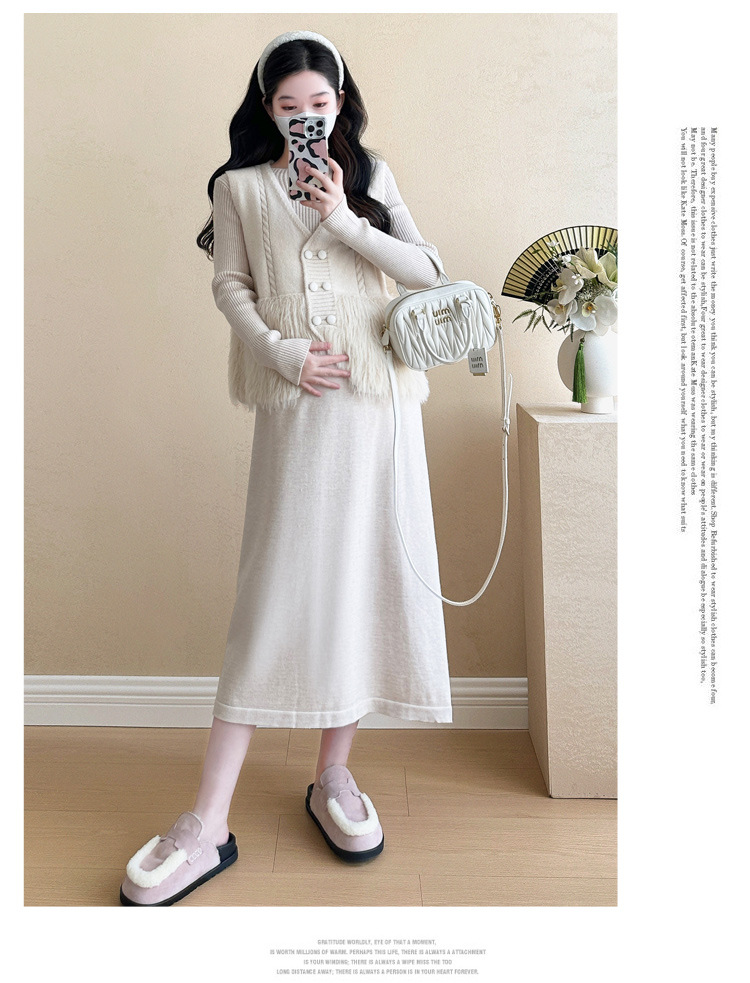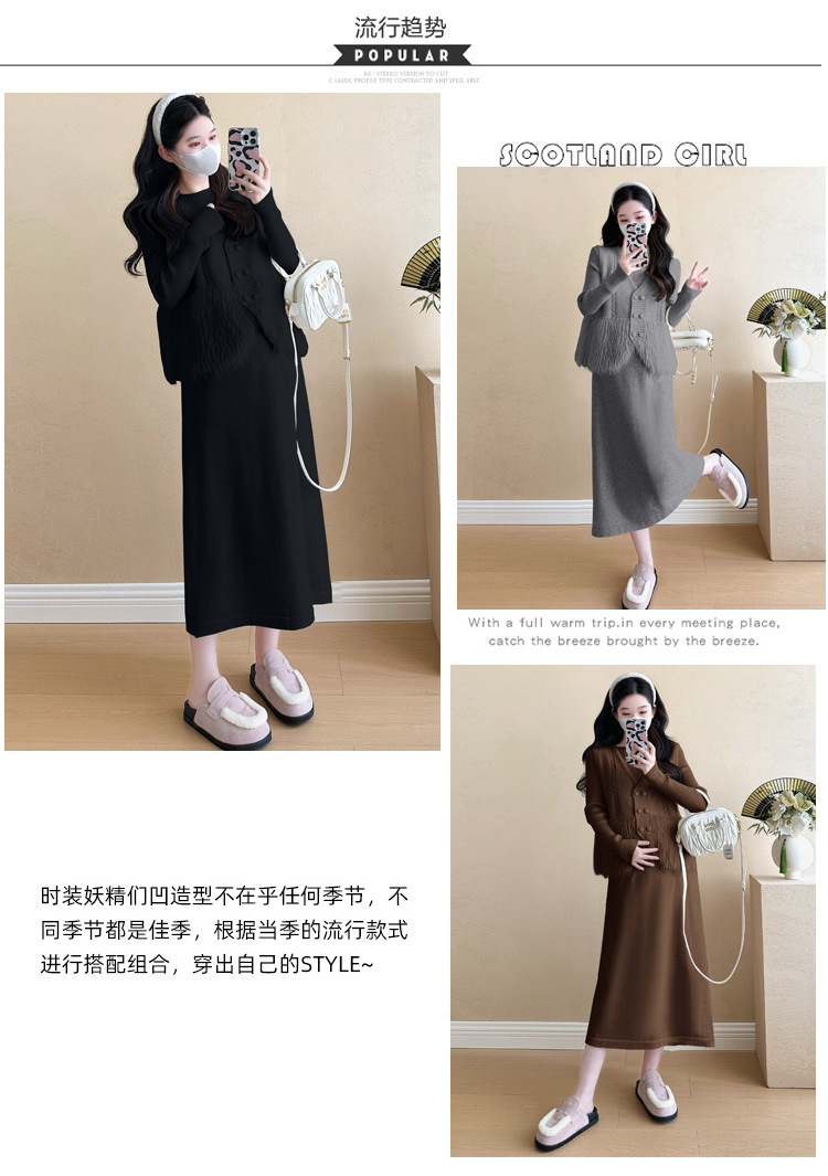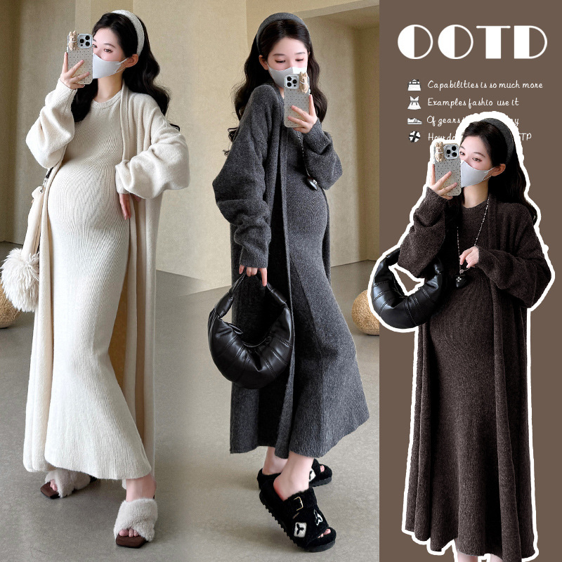 孕妇装秋冬新款连衣裙套装宽松时尚潮妈法式减龄显瘦开衫针织长裙