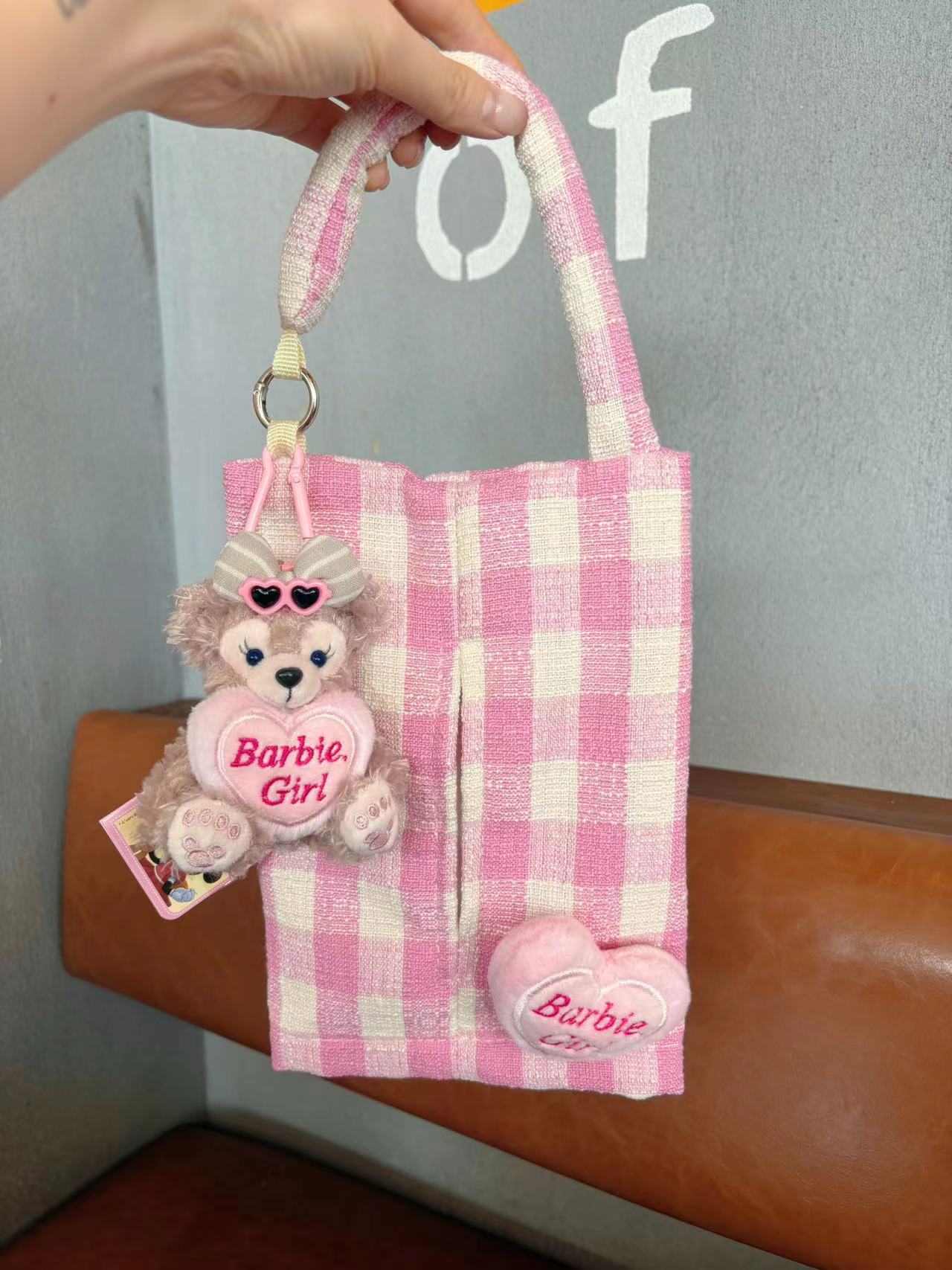 かわいいベアーの薔薇のダッフィーのバッグには、アニメのぬいぐるみのベアーのキーホルダーが飾られてプレゼントされています