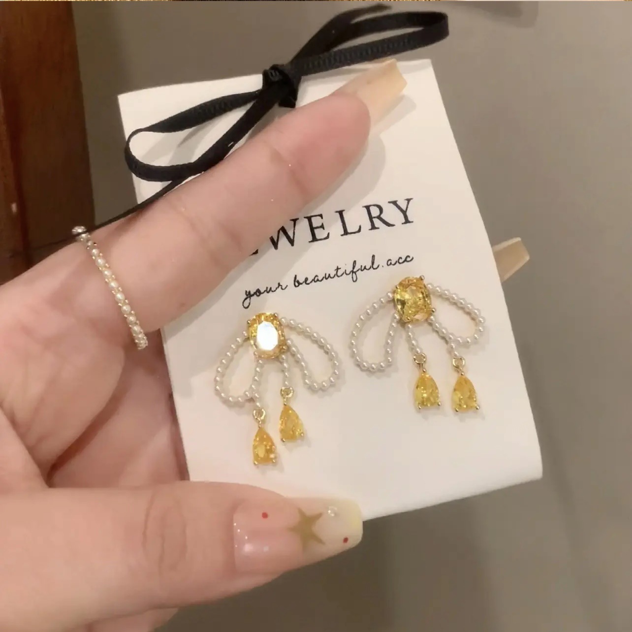 925銀針ピアスレトロ黄色水滴真珠蝶結びピアスバレエ風フリンジ高級感ピアス女性