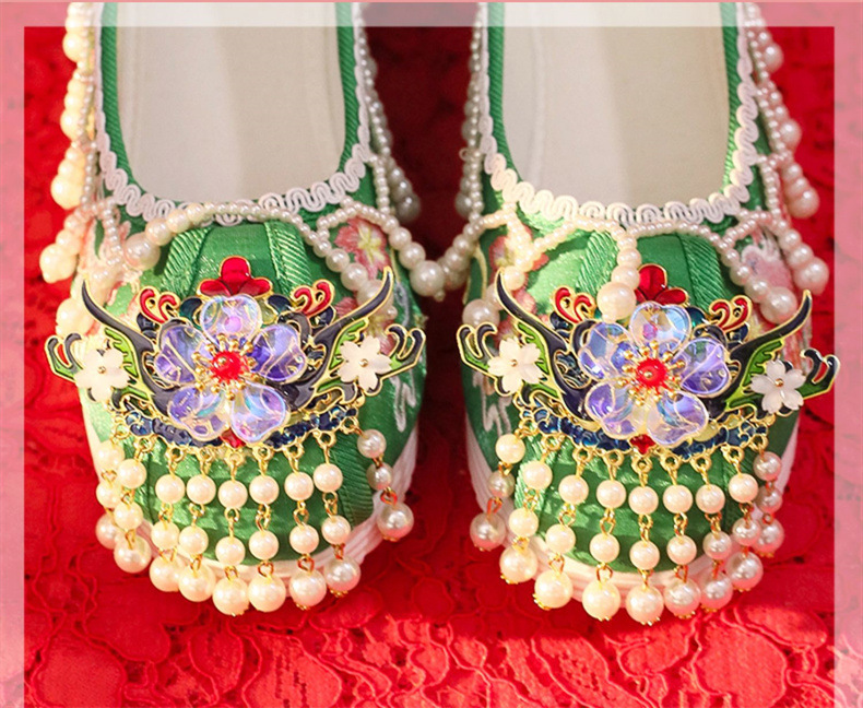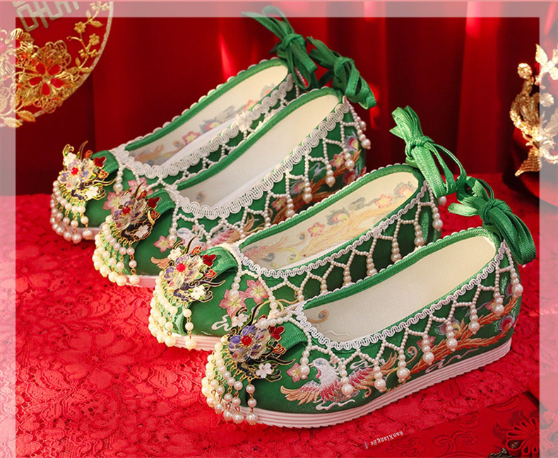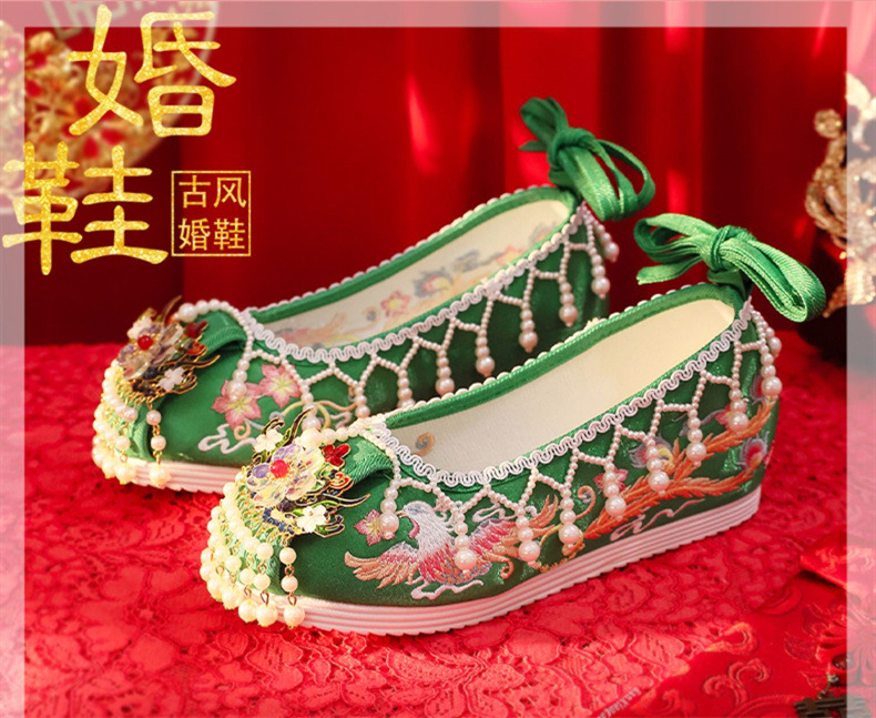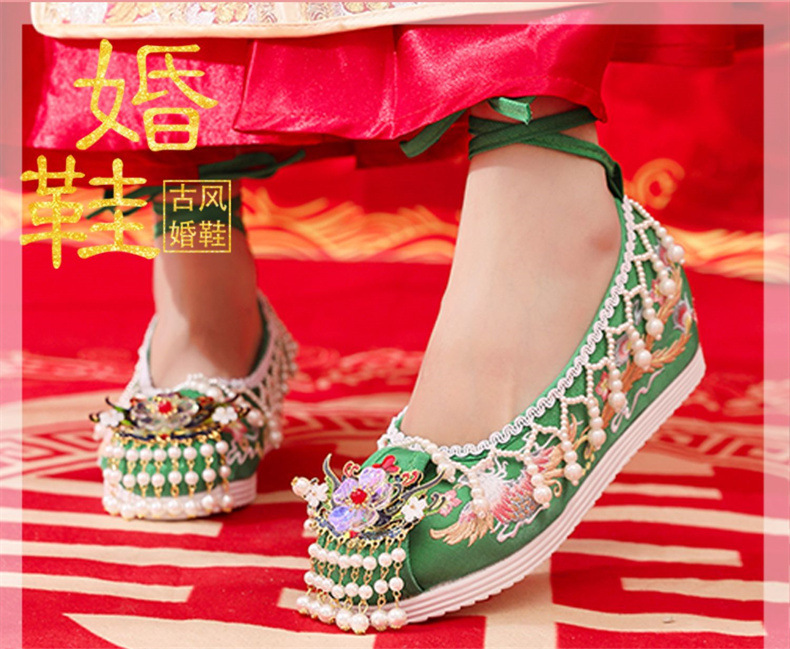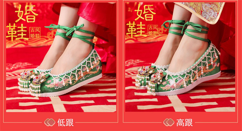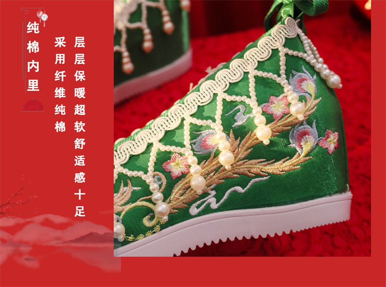 容顔オリジナル秀禾服チャイナウェディングシューズ 明時代風古装古風ウェッジヒール漢服刺繍靴 身長アップ刺繍靴 女性用