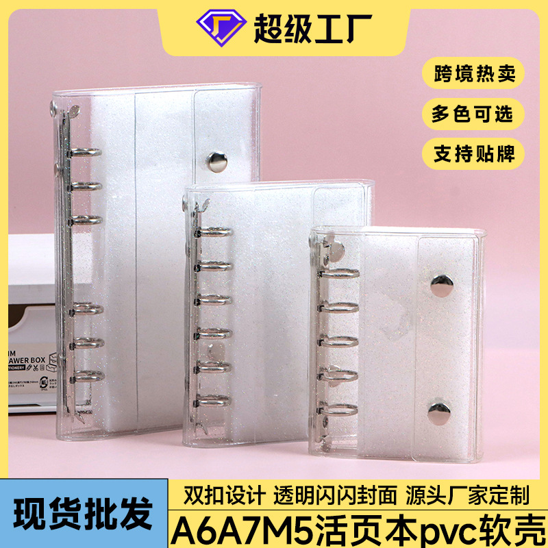 速卖通热卖A6A7M5透明闪闪双扣PVC活页手账外壳三折单软壳6孔卡册
