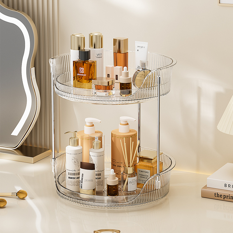 軽くて豪華な化粧台の化粧品の透明な回転の収納棚のトイレのデスクトップの香水のスキンケアの棚のトレー