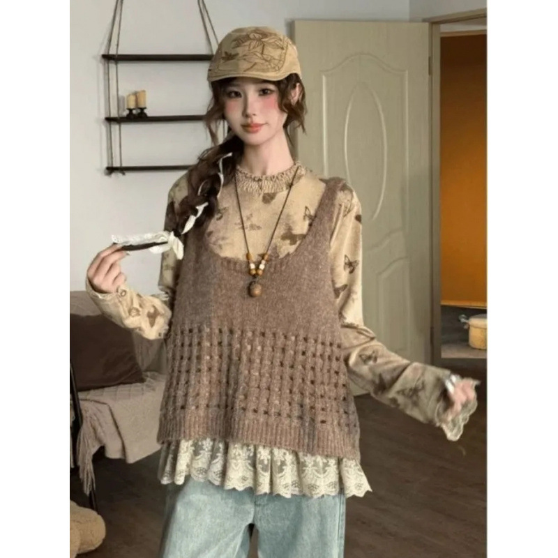 春秋新款时尚复古风套装女长袖上衣打底衫叠穿外搭背心吊带马甲