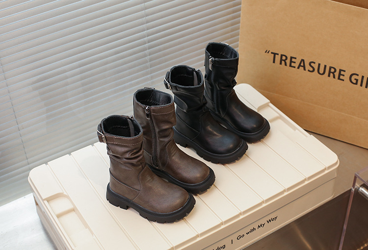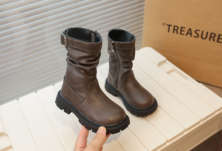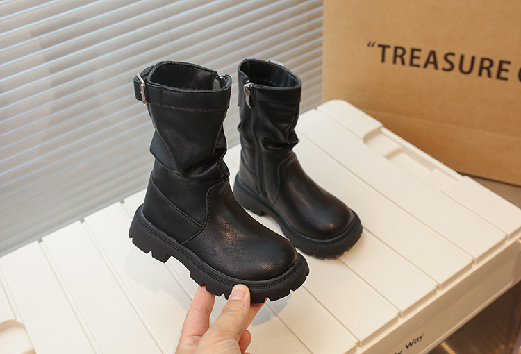 儿童堆堆靴2025秋冬季新款韩版女童加绒褶皱短筒靴复古显瘦骑士靴