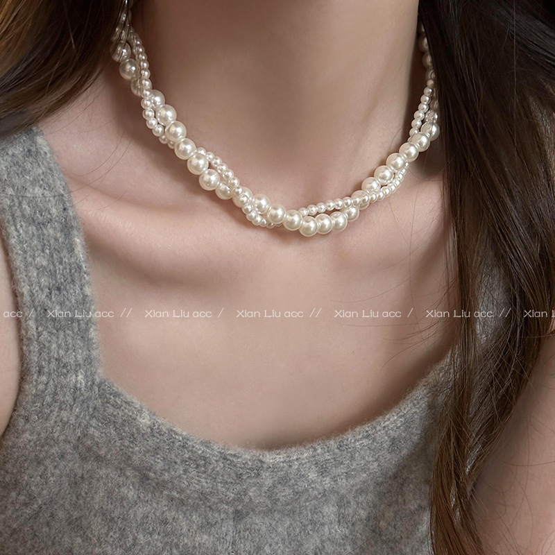 二重に真珠のネックレスを巻いて女性を飾っています。