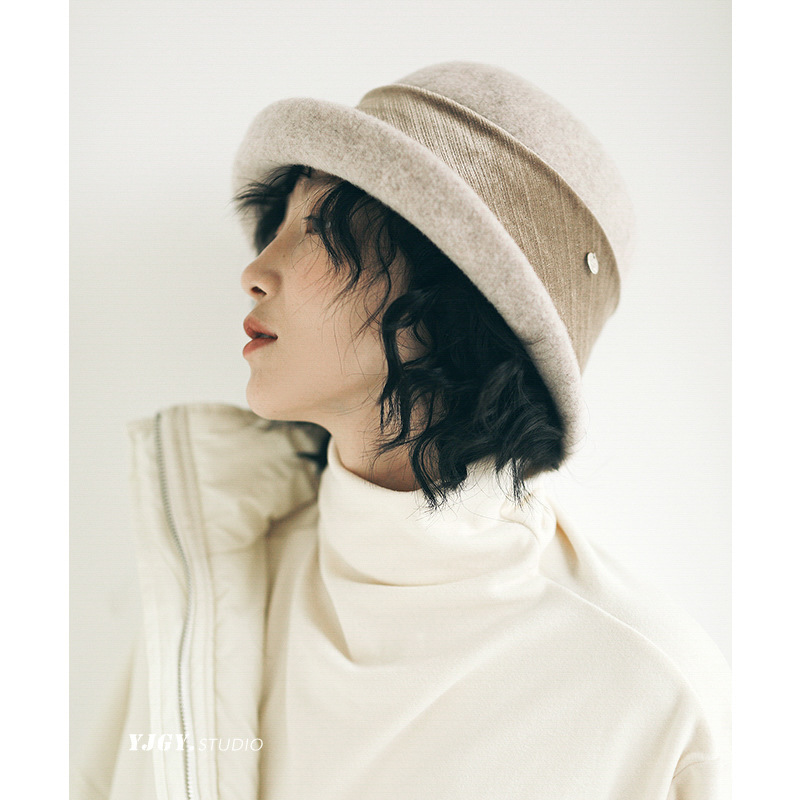 日系羊毛呢卷边渔夫帽女秋冬纯色百搭保暖盆帽显脸小气质卷边礼帽