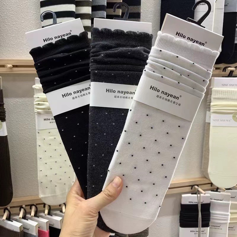 波点袜子女春秋季花边中筒棉袜美拉德咖色配勃肯鞋韩版简约堆堆袜