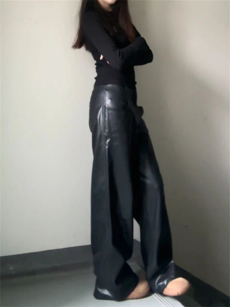 大きいサイズの太ったmmのアメリカ式の高い街のvibeの復古的なPUの皮のズボンの女性の潮の秋の小さいラッパのズボンはやせている広足のズボンを現します。